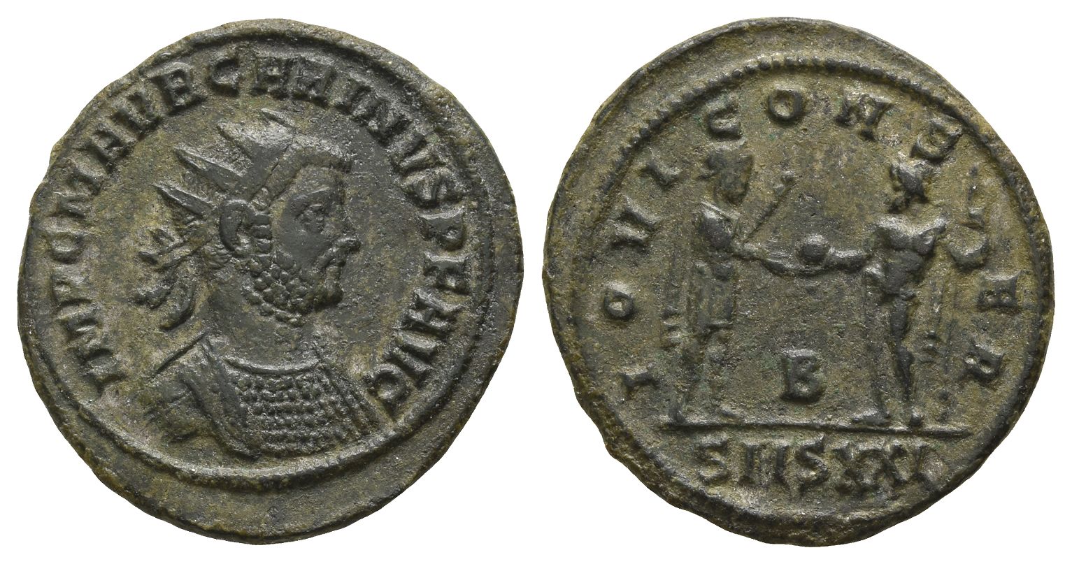Siscia mint; struck AD 284. 2nd officina. IMP C M AVR CARINVS P F AVG, radiate and cuirassed bust to right / IOVI CONS-ER, Carinus standing to right, holding sceptre and receiving globe from Jupiter standing to left, holding sceptre; B between, SMSXXI in exergue. RIC V 314; Pink VI/2, p. 44. 4.24gr, 23mm, 6h.