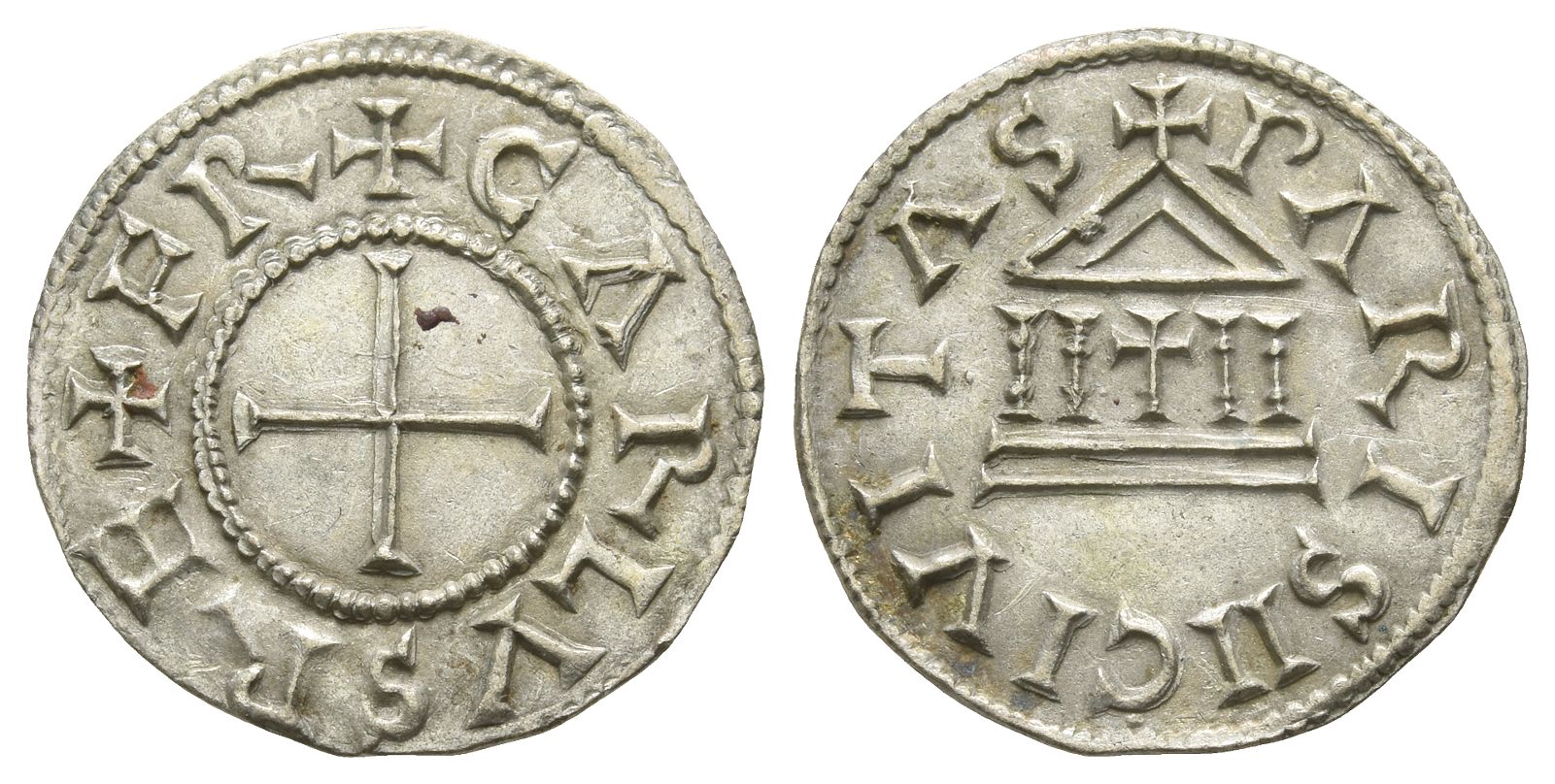 Paris mint. Class 1. ✠ CARLVS REX FR, cross pattée / PARISII CIVITAS, temple with central cross. Depeyrot 762; Prou, Carolingiennes 323; M&G 827; MEC 1, 843. 1.75gr, 20mm, 4h