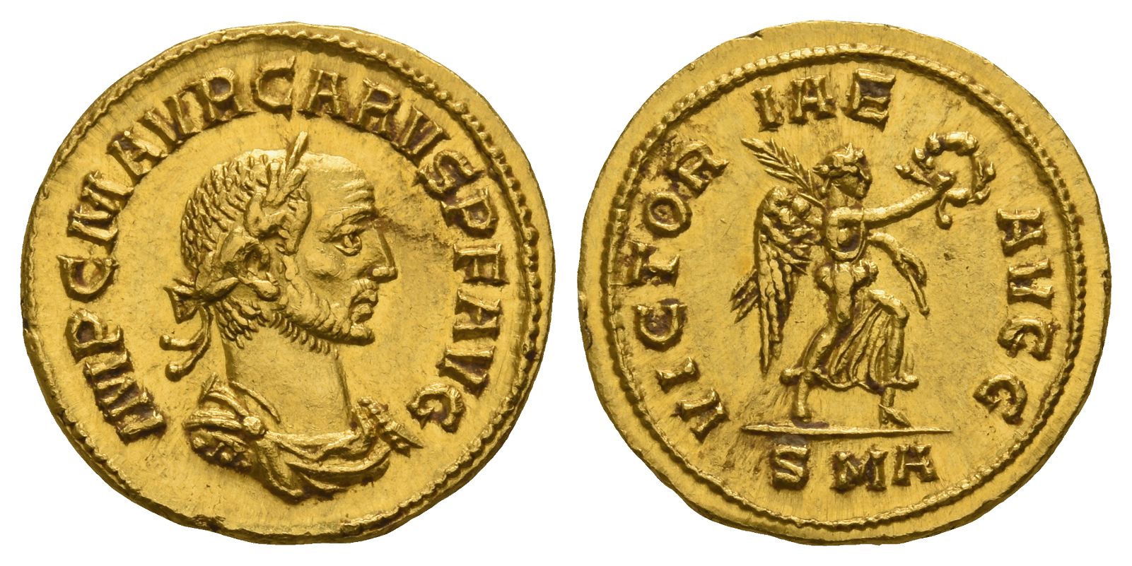 Antioch mint. IMP C M AVR CARVS P F AVG, laureate, draped and cuirassed bust to right / VICTOR-IAE AVGG, Victory advancing to right, holding palm frond over left shoulder and wreath in her right hand; SMA in exergue. RIC V.2 122; Calicó 4290; Cohen-. 5.02gr, 20mm, 12h.