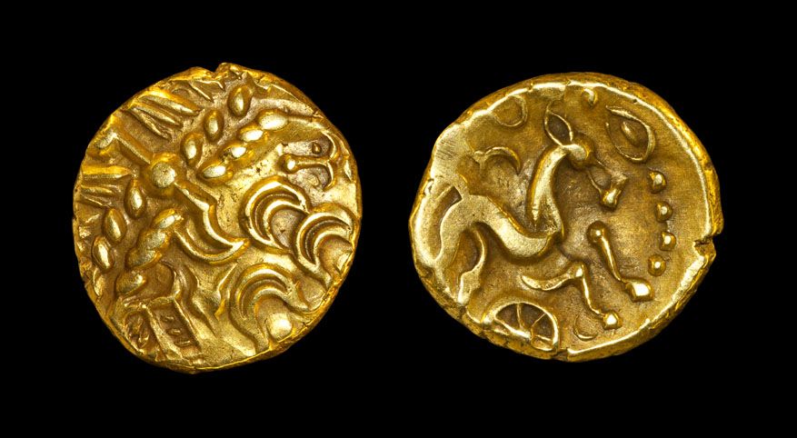 Circa 1st century BC. Obv: wreath design with 'face' symbol above crescents. Rev: triple-tailed horse right with charioteer's arm and showing and 'wheel' below. This issue was the protoype from which the British SO5-6 Selsey Two-Faced type was apparently copied (see S. 38). Gold, 6.07 grams.