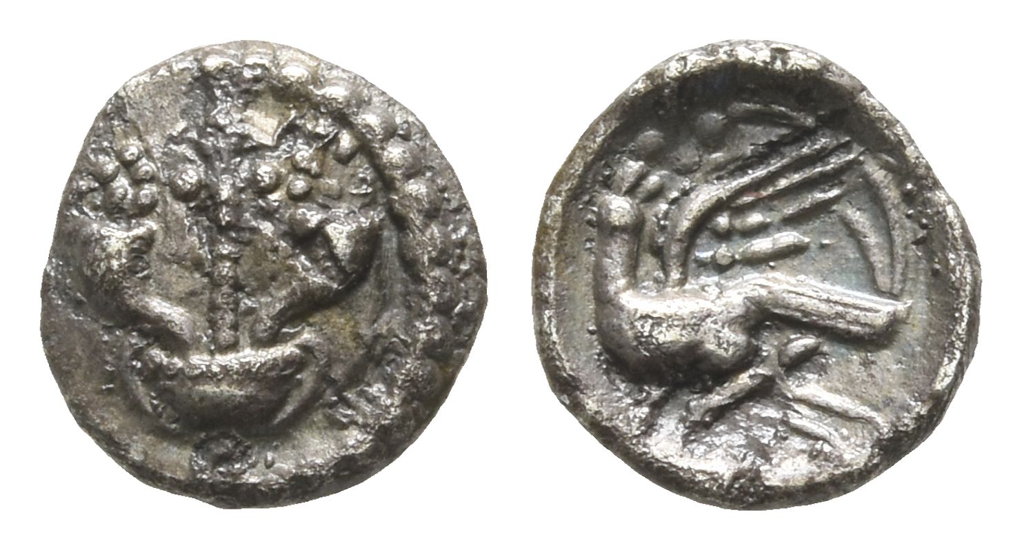 Thyrsus between two cornucopiae, all standing within two-handled wine cup / Eagle standing to left on vine, his head turned back to right, pecking on a bunch of grapes. ABC 1322; Bean VECS3-2; BMC 1543-58; SCBC 154; VA 555. 0.28gr, 8mm, 1h.