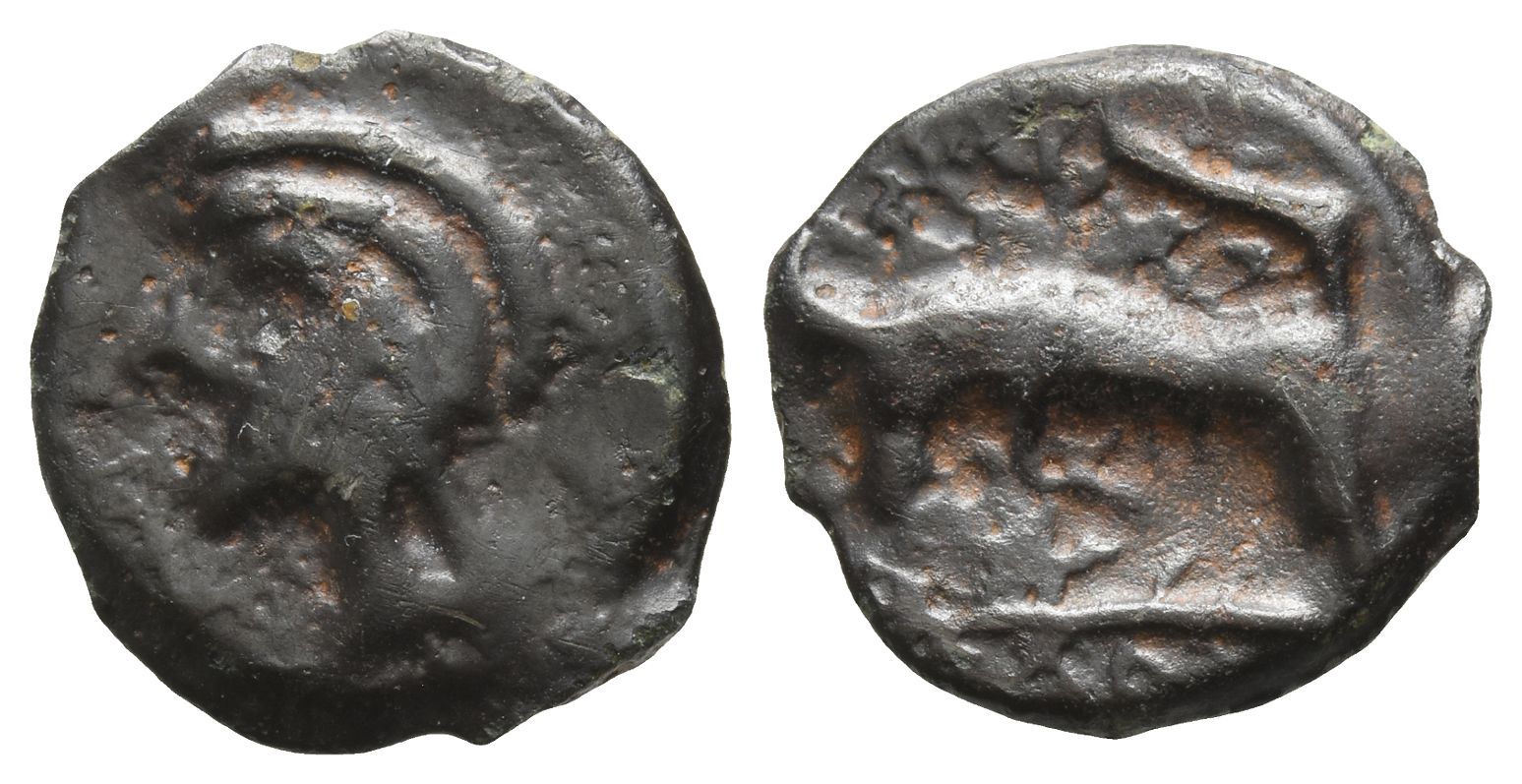 Degraded head of Apollo to left / Degraded bull butting to left on exergual line. ABC 147; VA 104-105; BMC 667. 2.70gr, 18mm, 10h.