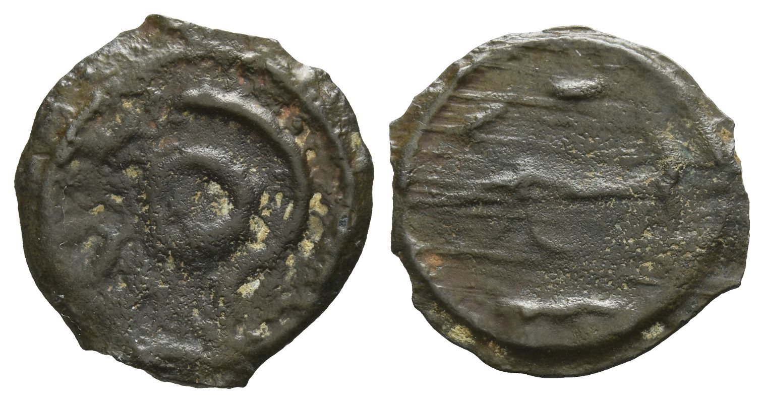 Outline head to left with central circle (no pellet) / Outline bull charging to right; two crescents above. ABC 165; Van Arsdell 123-1. 1.86gr, 19mm, 3h.