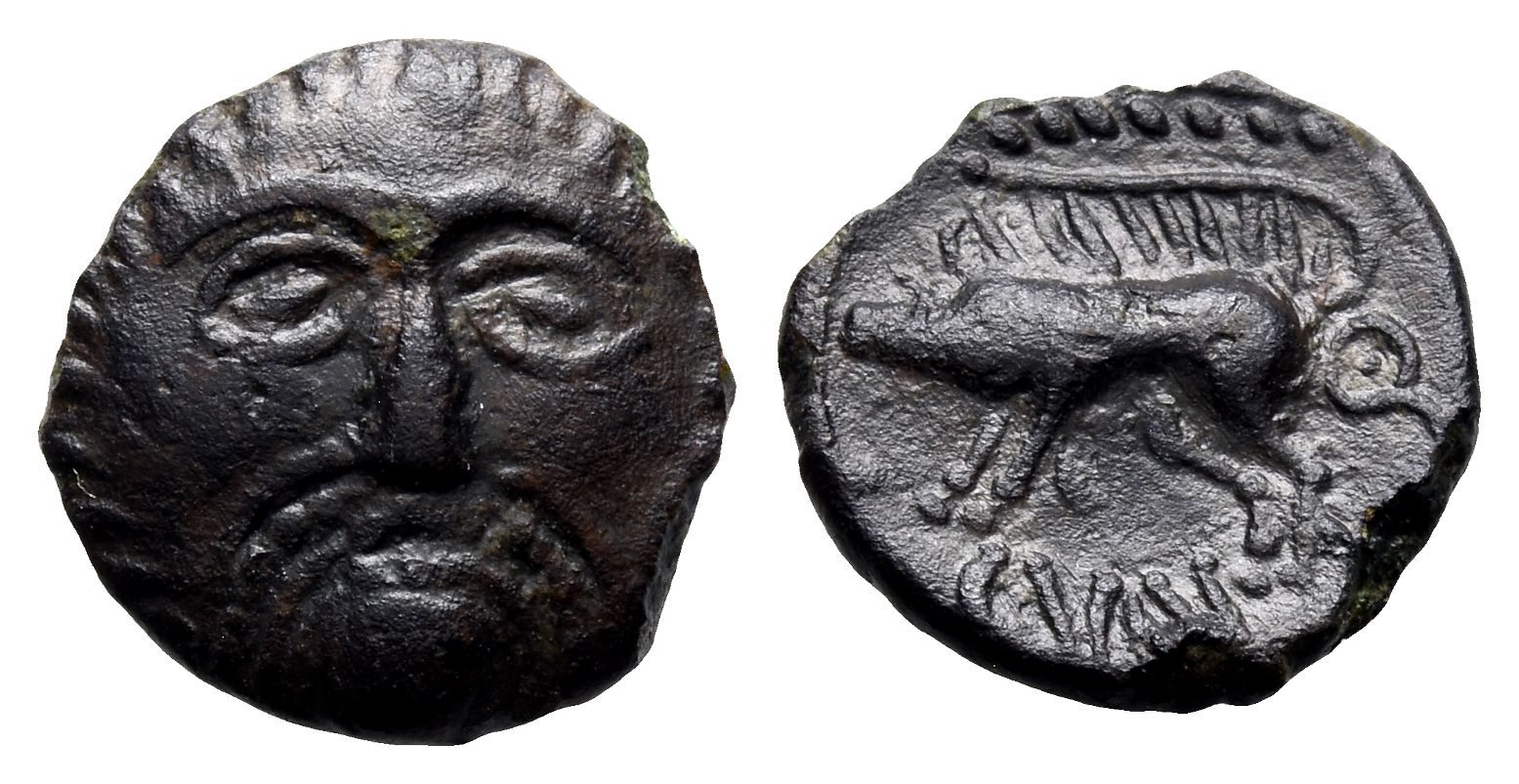 Facing head with walrus moustache and beard / Boar to left, branch above, CVN below. ABC 2912; VA 1963; BMC 1904-05, SCBC 326. 1.38gr, 13mm, 10h.