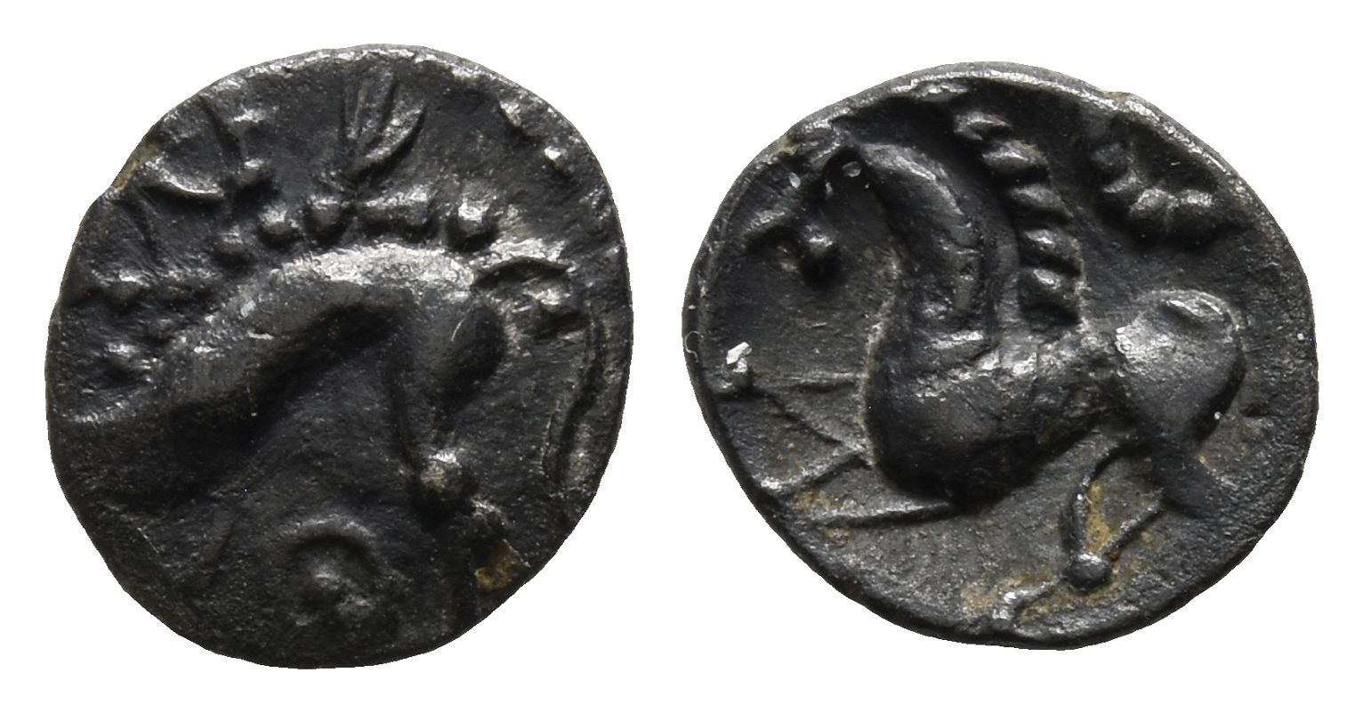 Boar to left; wheel above, pellet-in-annulet below / Horse to left, pelleted ring above. 0.46gr, 10mm, 2h.