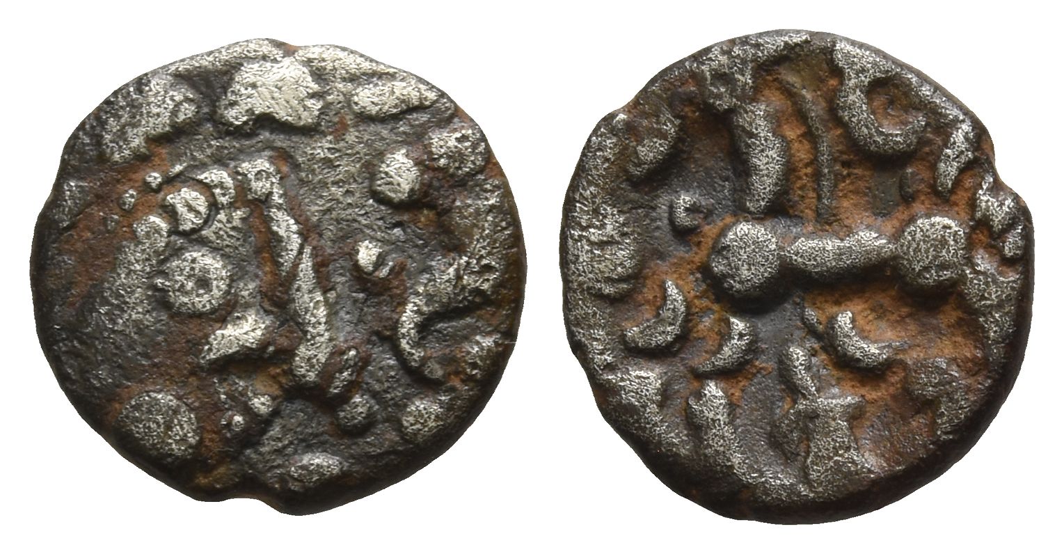 (Dobunnic B) type. Uninscribed. Stylised head to right; large boss on chin, stalk lips / Triple-tailed horse leaping to left; flower motif below, stylised bird's head above. Van Arsdell 1042-1 (Corio); ABC 2015; SCBC 377. 0.78gr, 12mm, 4h.