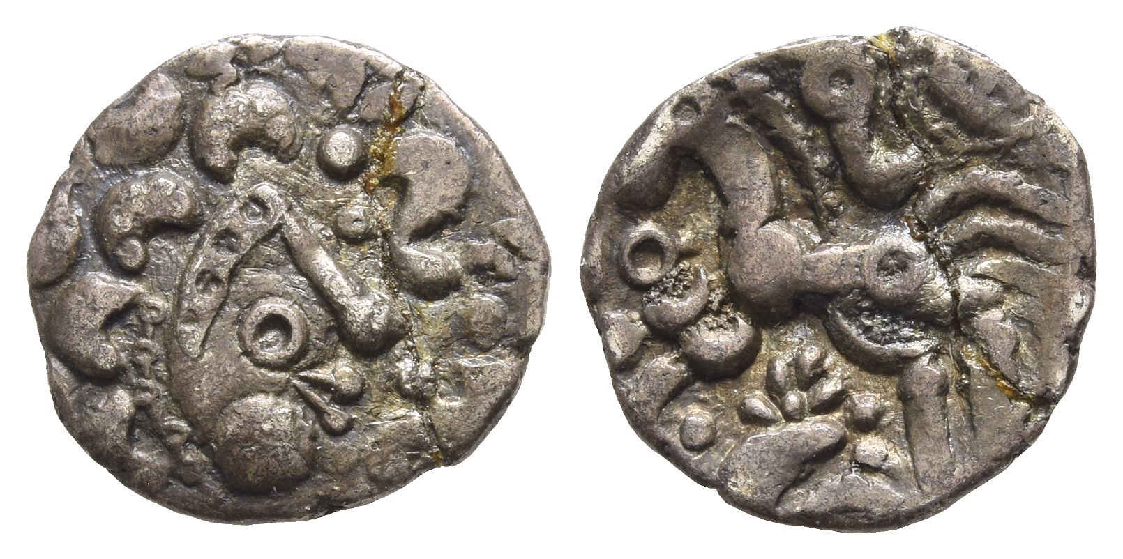 Profile moon head (type B) to right, pelletted crescents for hair, large boss on chin, stalk lips / Celtic triple-tailed annulate horse to left with annulets and symbols around; 'flower' symbol below, stylised bird's head above, three pellets in field. ABC 2015; Van Arsdell 1042; BMC 2953-62; SCBC 377. 1.02gr, 14mm, 8h.