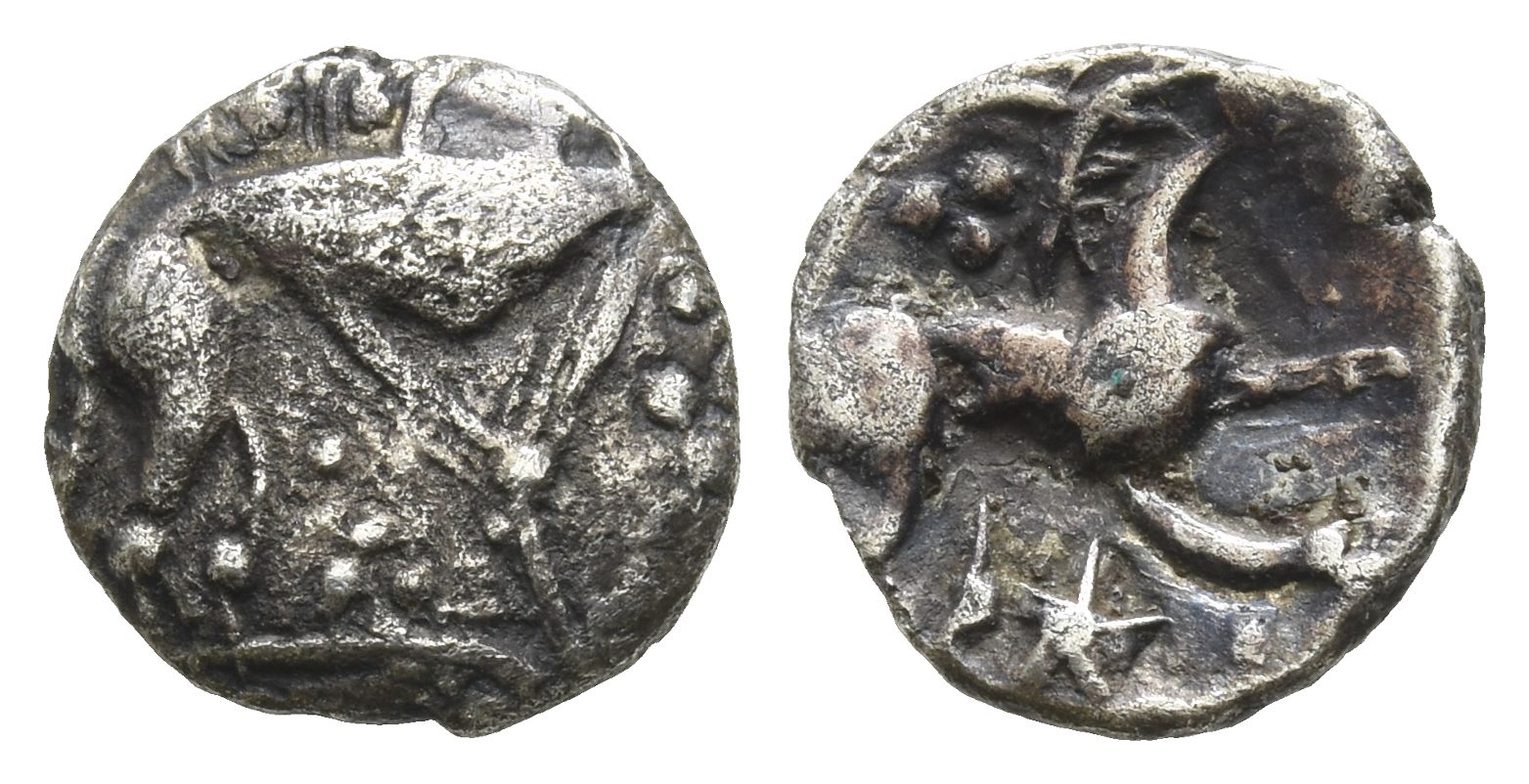 Stylised boar standing to right; four pellets below / Celticised horse prancing to right; pellet triad beneath arc from neck to rump above; star below. ABC 1579; Van Arsdell 657; SCBC 431. 0.82gr, 12mm, 10h.