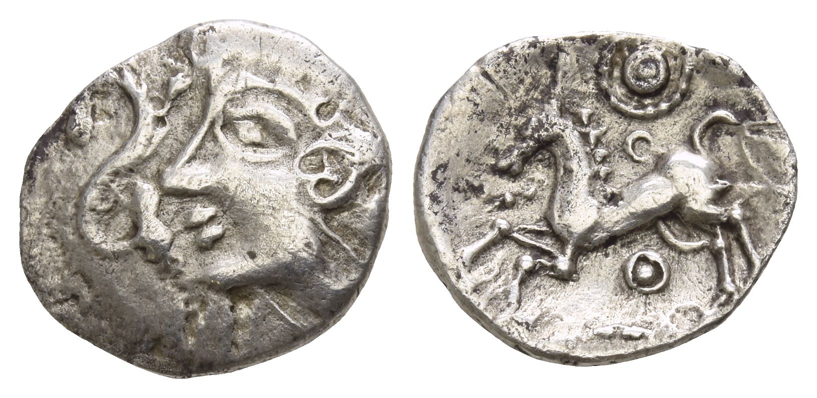 Diademed female head to left; snake symbol before / Horse leaping to left; annulet and pellet boss in ring of pellets above, pellet-in-annulet below. ABC 1495; VA 80-1 (Imported); SCBC 432. 1.38gr, 15mm, 1h.