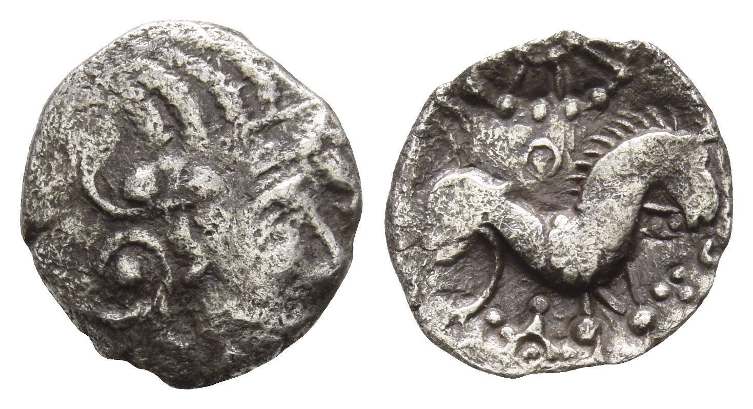 Diademed head to right; [stars before] / Horse prancing to right; pelleted wheel above, star below. ABC 1501; VA -; SCBC 432. 0.75gr, 13mm, 5h.
