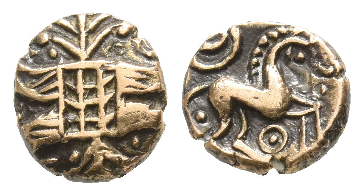 Branches projecting from latticed square / Long-legged horse right, beaded mane, crescent 'smile' above, ringed-pellet below. ABC 1480; VA-; BMC 3437-38; S 430. 1.12gr, 9mm, 4h.