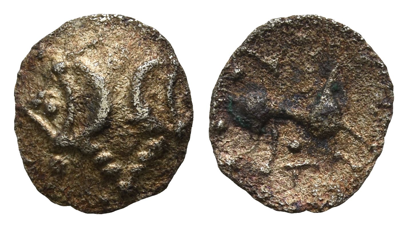 Mini Ed type. Double crescents within lozenge of corded lines / Horse to right, V-shape above, pellet and ED below. ABC 1690; Van Arsdell -; BMC -; SCBC -. 0.38gr, 10mm, 6h.