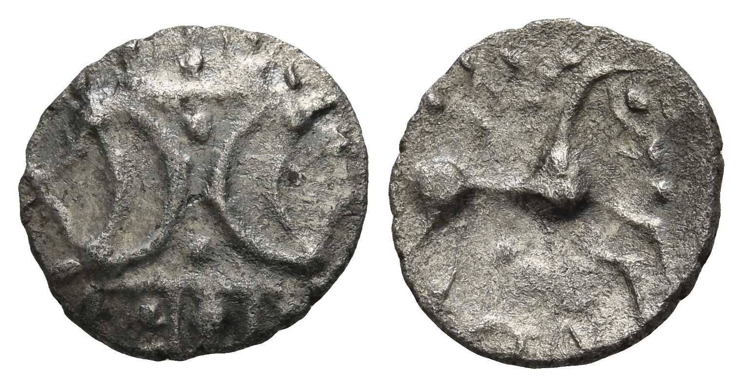 Icenian H type. Two outline crescents back-to-back, two pellets between, on a central band set on vertical wreath / Celticised horse to right, S beneath head, three pellets and [E]DN below. ABC 1672; Van Arsdell 734; BMC 4223-4281. 1.12gr, 14mm.
