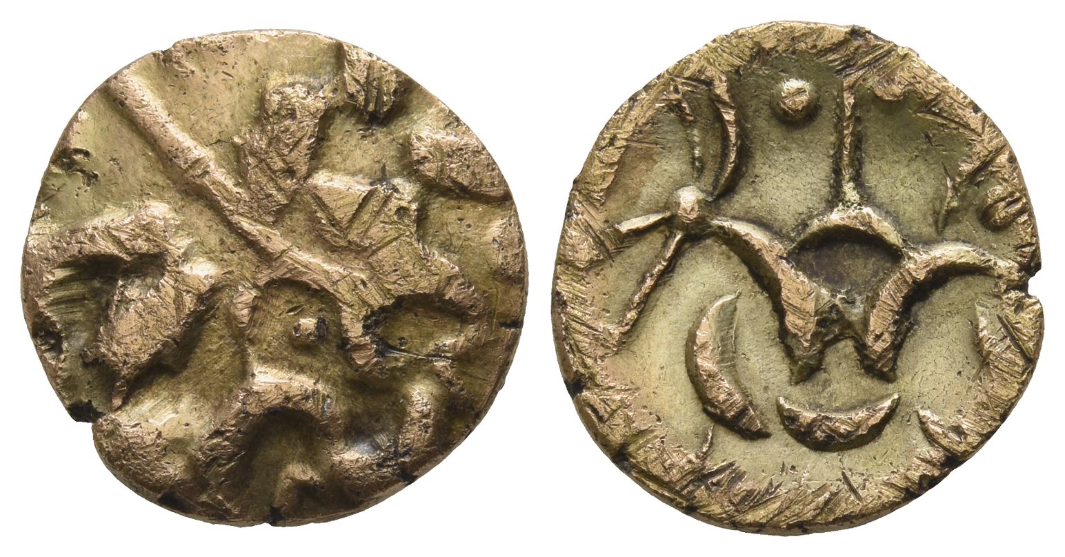 South Ferriby type (Corieltauvian D). Devolved head of Apollo to right / Disjointed horse to left; 'anchor' shape above. Cf. ABC 1743 (rosette beneath horse); Cf. Van Arsdell 811-1 (star beneath horse); SCBC 390 (same). 5.02gr, 18mm, 3h.