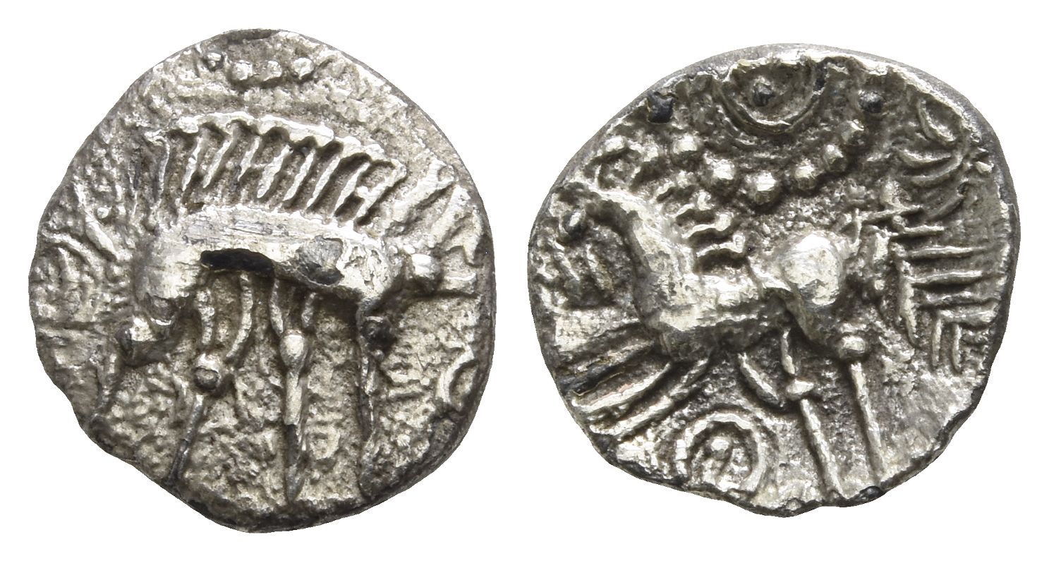 Boar right, with 'pin cushion' hackles, beaded ring above / Horse left, with 'pin cushion' mane and shaggy chevron tail, solar rings above, ringed-pellet below. ABC-; VA-; MBC-; S-. 1.09gr, 13mm, 10h.