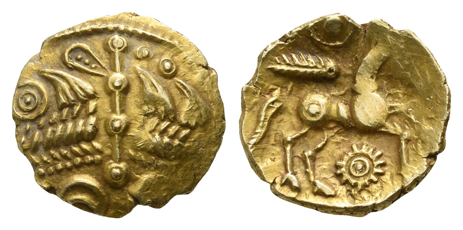 From Chris Rudd Auction 184, lot 25: "This splendid coin is packed with detail. The ring-ended, leafy emblem above and in the tribal mare’s tail must be its author’s personal signature, (also on silver unit ABC 2380), while the little split symbol in front, here exceptionally clear, suggests a clan associate. Several dynasts north of the Thames had vegetal emblems as insignia, and we know the names of two who later worked exactly this leafy motif into their stater designs: Tasciovanos (ABC 2553) and Andoco (ABC 2715). Our man’s sons, perhaps? There’s a handsome little hidden face at 6 o’clock on the obverse. See Hidden faces on Celtic coins, Coin News, November 2019, pp.41-43. Not in VA, BMC nor Spink."