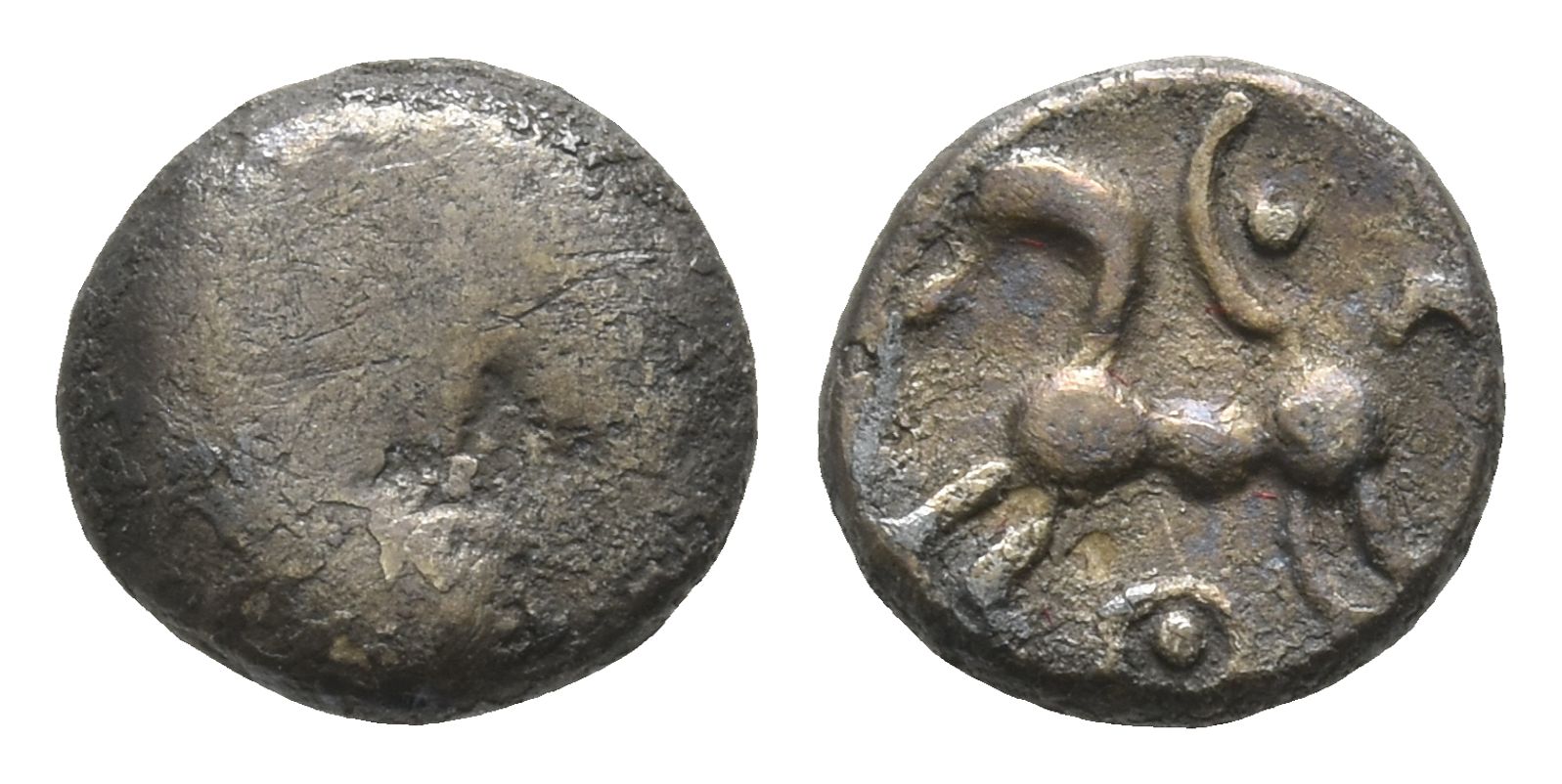 Irregular raised surface / Horse to left; above, slightly curved line with thickened ends, pellet within volute-like loop below. Dembski, MÖNG 1991, 2; Lanz 94. 0.80gr, 9mm.