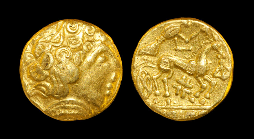An example of the same type was found at Margate, Kent in the 19th century (now in the British Museum collection). Scheers in The Origins and Evolution of Coinage in Belgic Gaul, figure 6, coin 9, illustrates the Tarentum prototype for this Gaulish copy.