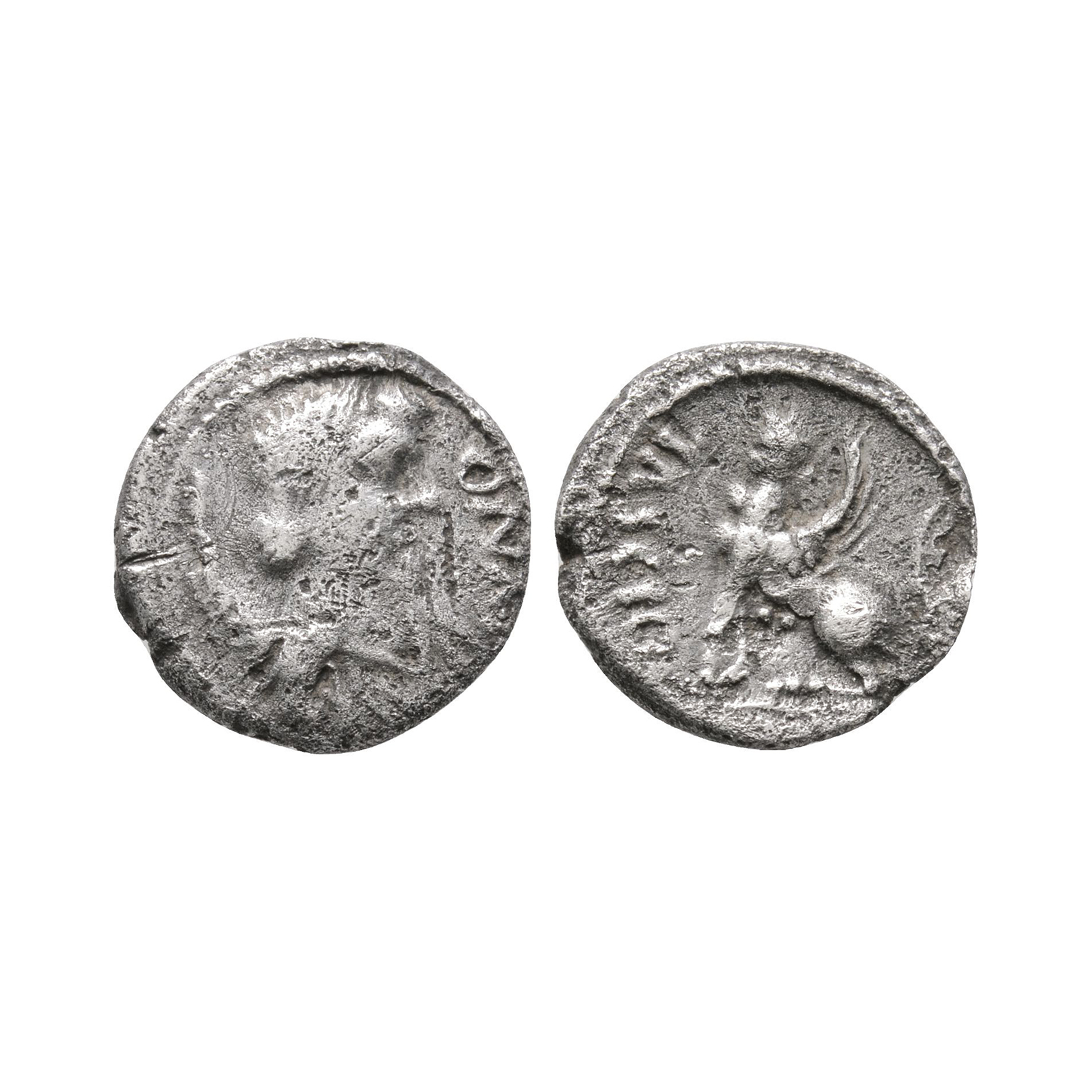 Obv: winged bust right, CVNO before. Rev: sphinx seated left, TASCIO before. 1.20 grams, 13 mm.