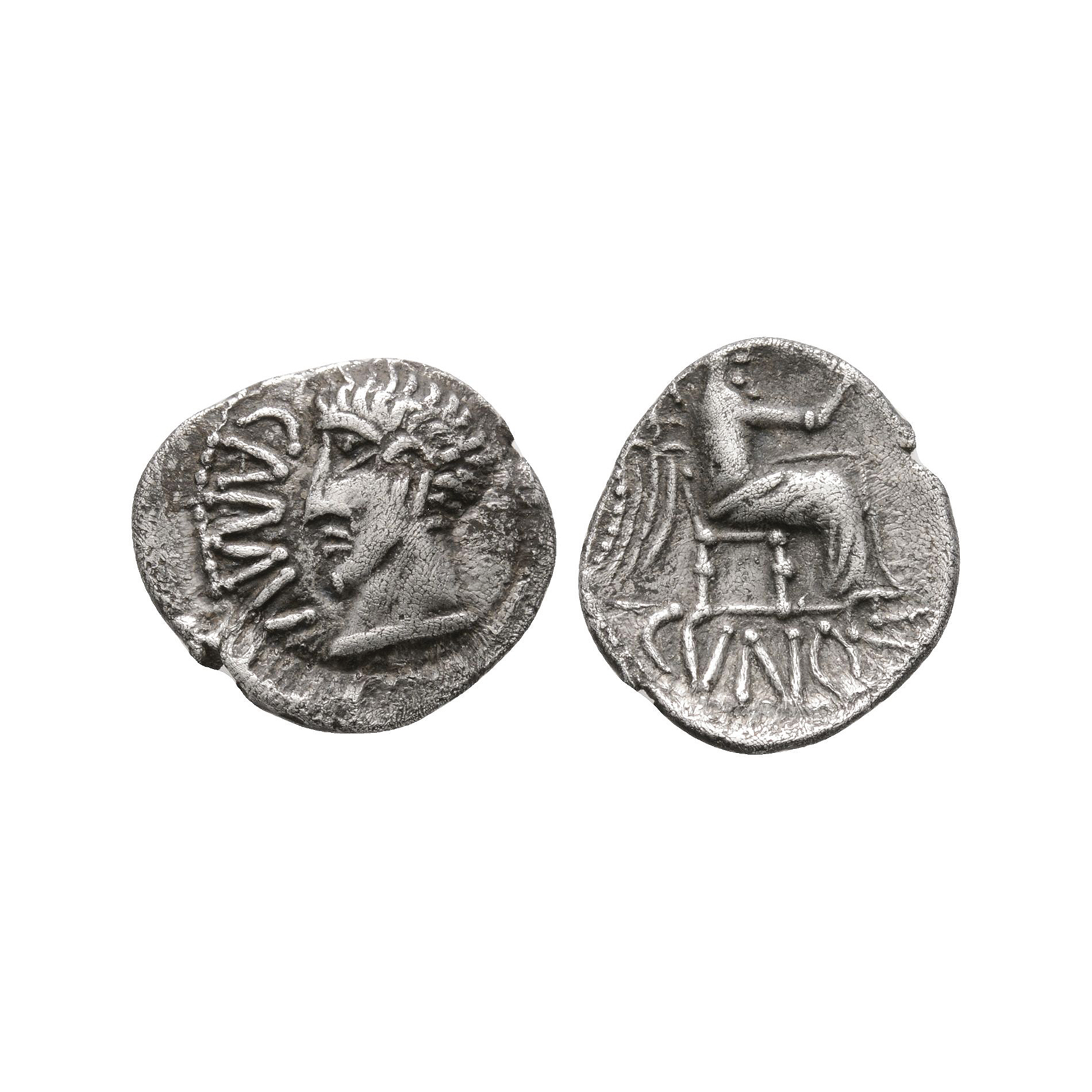 Obv: bust left with hair spiked, CAMVL before. Rev: seated victory right holding up object, CVNO below. 1.26 grams, 14.42 mm.