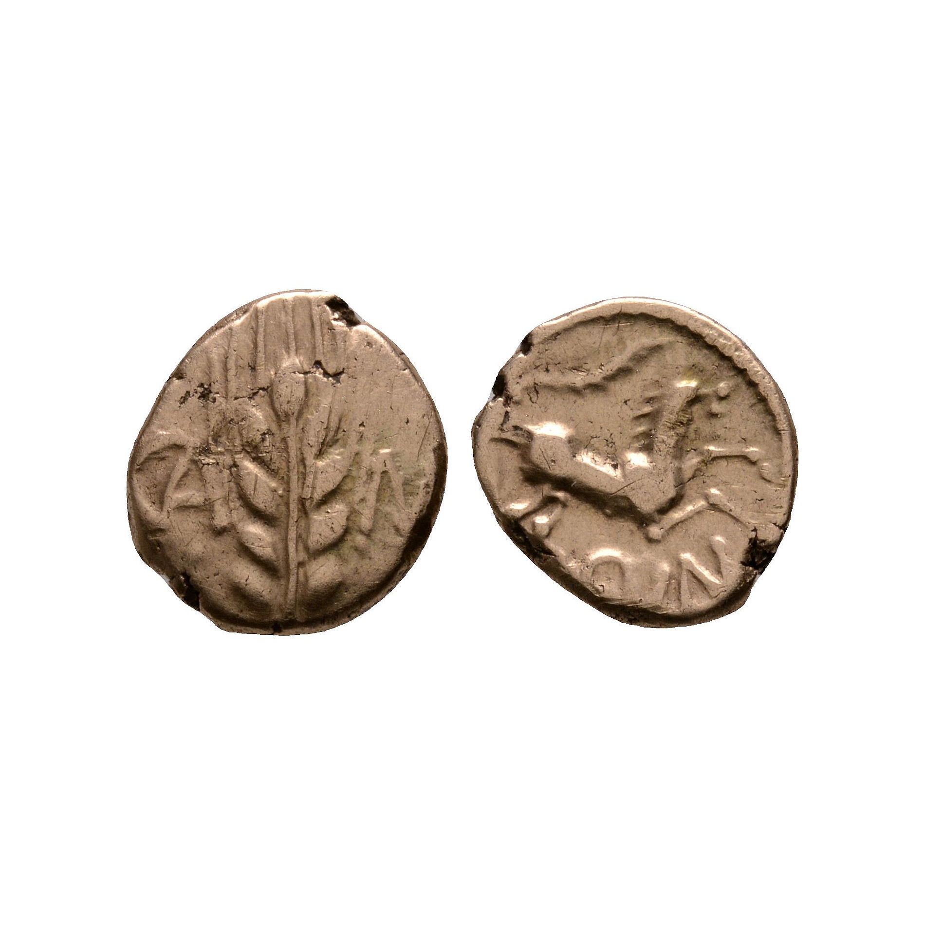 Obv: corn-ear dividing CA - MV. Rev: horse right with CVNO below. 1.28 grams.
