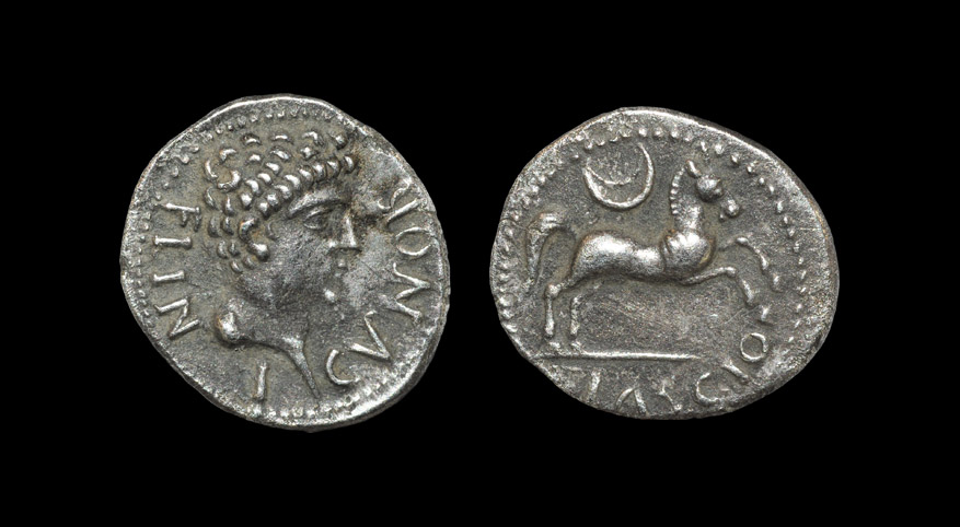 1-40 AD. Obv: profile bust right with CVNOB - ELIN - I legend. Rev: rearing horse right with hollow crescent above and TASCIO legend below. 1.34 grams.