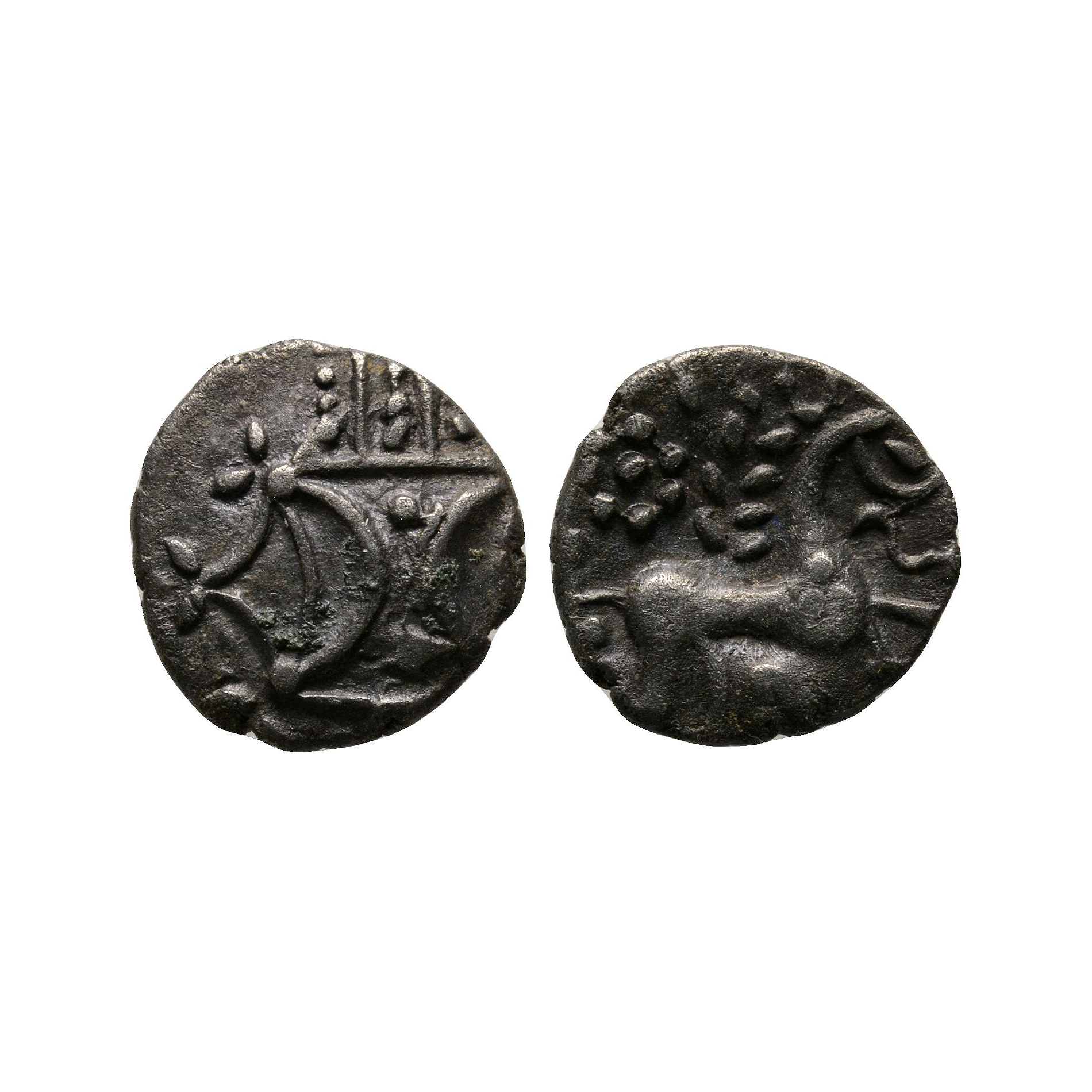Obv: double crescent on vertical wreath. Rev: horse right with corn-ear mane with pellet trefoil and ANTD monogram below. 1.04 grams, 13.18 mm.
