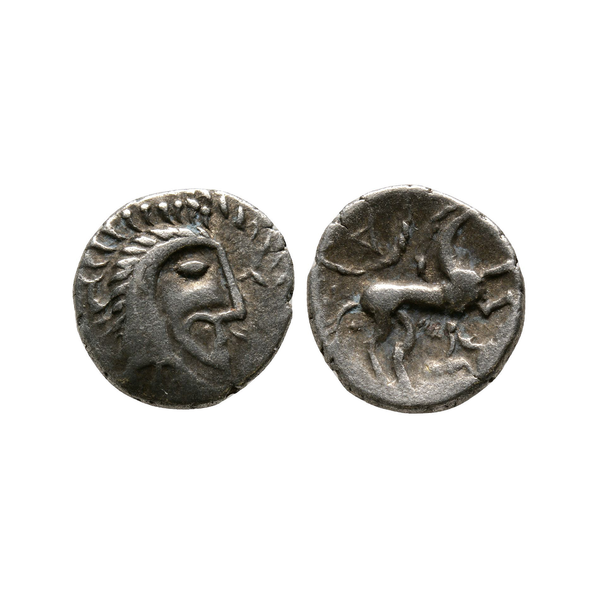 Obv: profile bust right with 'moustache' and oval eye and trefoil before. Rev: horse right with pelta with tricorne above and lozenge with concave sides and pellets at points below. 1.22 grams, 14.37 mm.