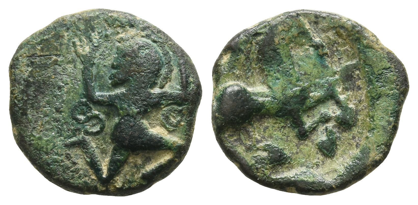 Celticised figure running to right or dancing, helmetted head to left, pellet-in-annulets flanking / Horse galloping to right. Cf. DT 291; cf. LT 7258. 3.15gr, 17mm, 12h.