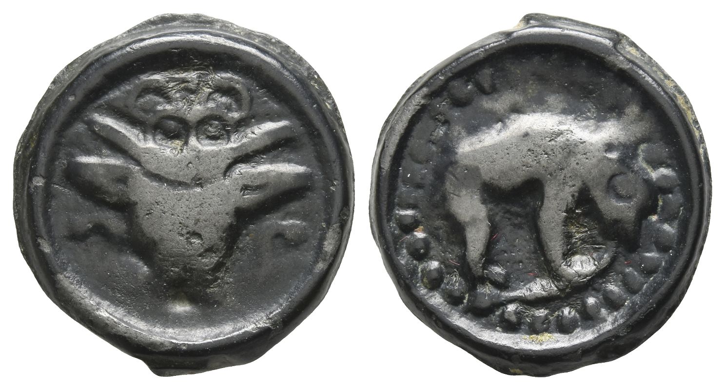 Bucranium; pellet-in-crescents above, S-ornaments flanking / Bear(?) to right, trampling on serpent(?). Depeyrot, NC VII, 34; D&T 221; CCCBM III 511-8. 5.74gr, 20mm, 5h.