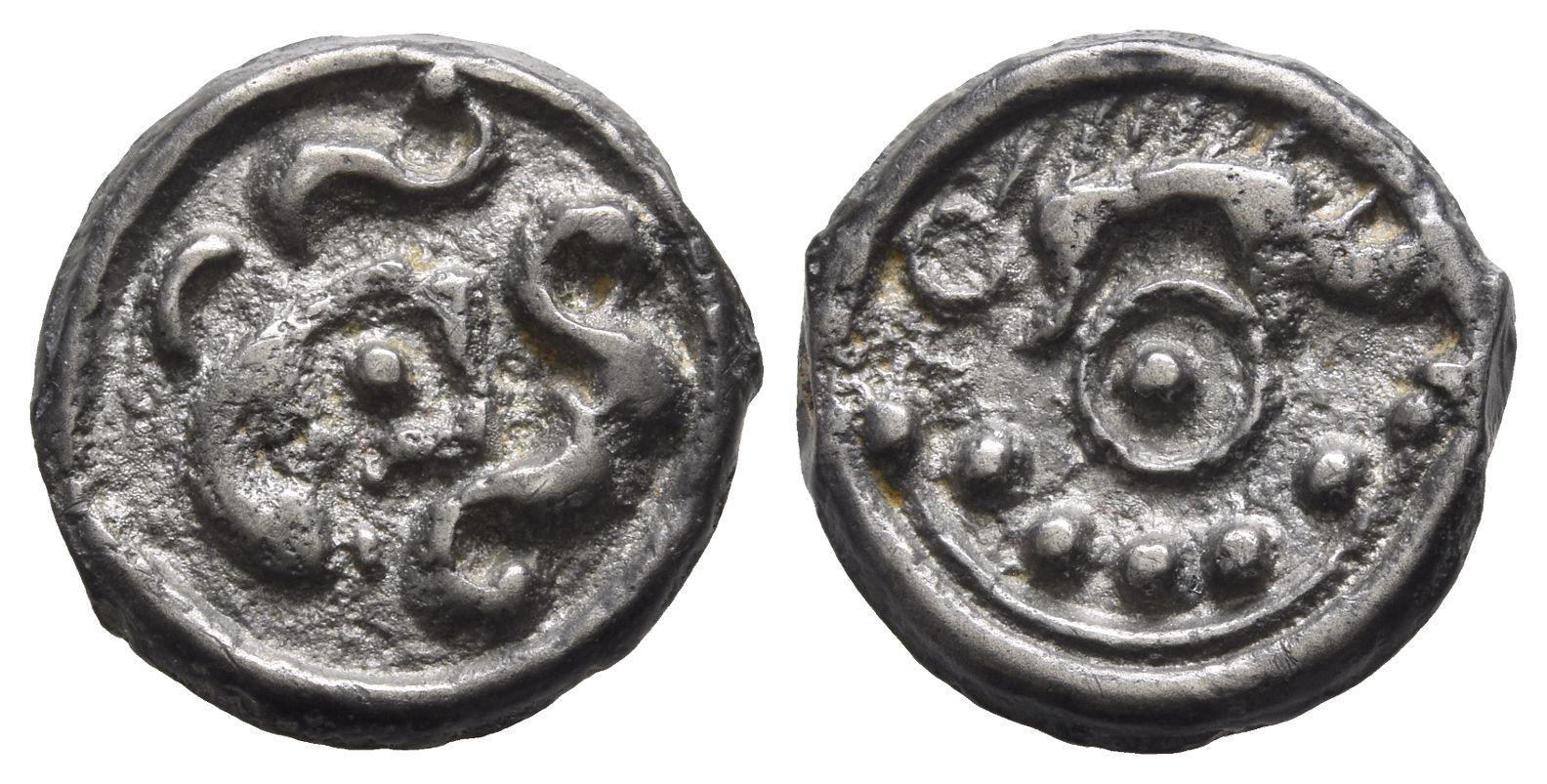 Stylised head to right / Abstract boar to right above central pellet-in-annulet; annulet to left, five pellets and torque below. Depeyrot, NC VI, 123; D&T 530; CCCBM III 444-7; de la Tour 7905. 3.19gr, 18mm, 9h.