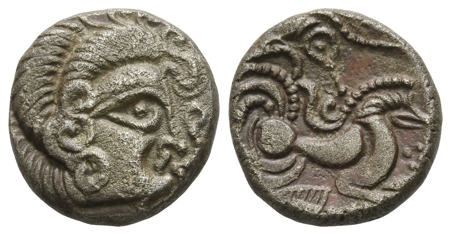Stylised head to right, hair in large spiral curls, S-like ear; pearl strings flowing around / Stylised charioteer driving biga to right; below, boar to right; pearl string flowing above, ornaments around. Depeyrot, NC VIII, 178; DT 2334. 6.52gr, 19mm, 7h.