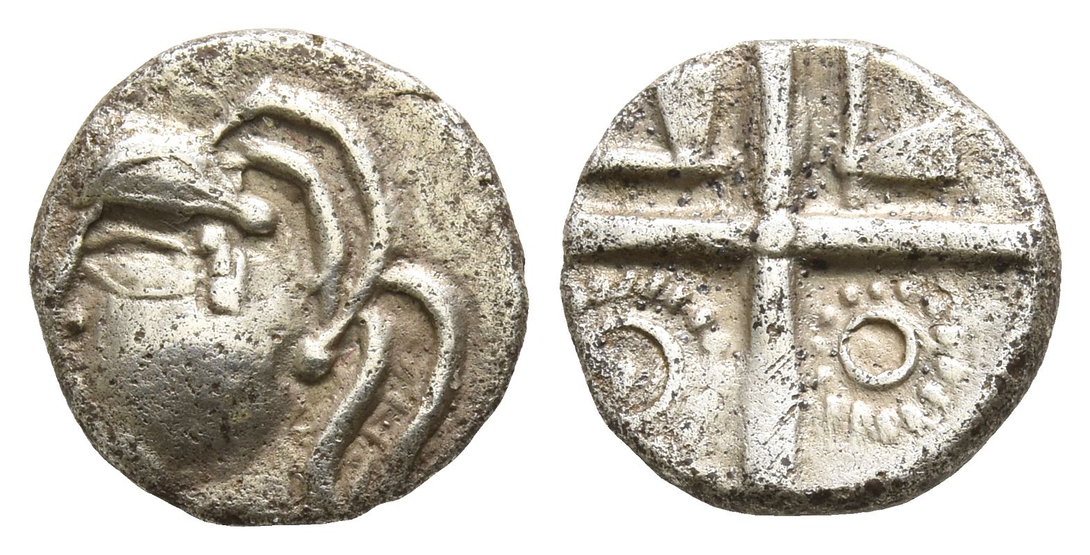 Head left, with elliptical eye, large open crescents for hair / Cruciform motif, axes and pelleted-rings in angles. Saves 220-222; BN 3525-28; BMC 81. 1.74gr, 13mm.