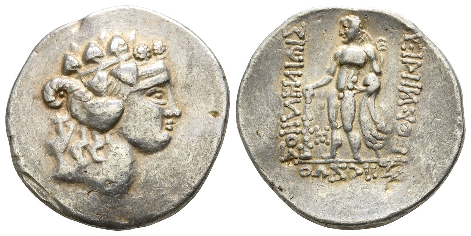 Head of youthful Dionysos to right, wearing ivy wreath, and with his hair partially knotted at the back and partially falling down the back of his neck / Herakles, nude but for laurel wreath and lion's skin over his left shoulder, standing to left, holding club with his right hand, monogram to inner left; blundered legend around. OTA, Class II. 17.24gr, 32mm, 2h.
