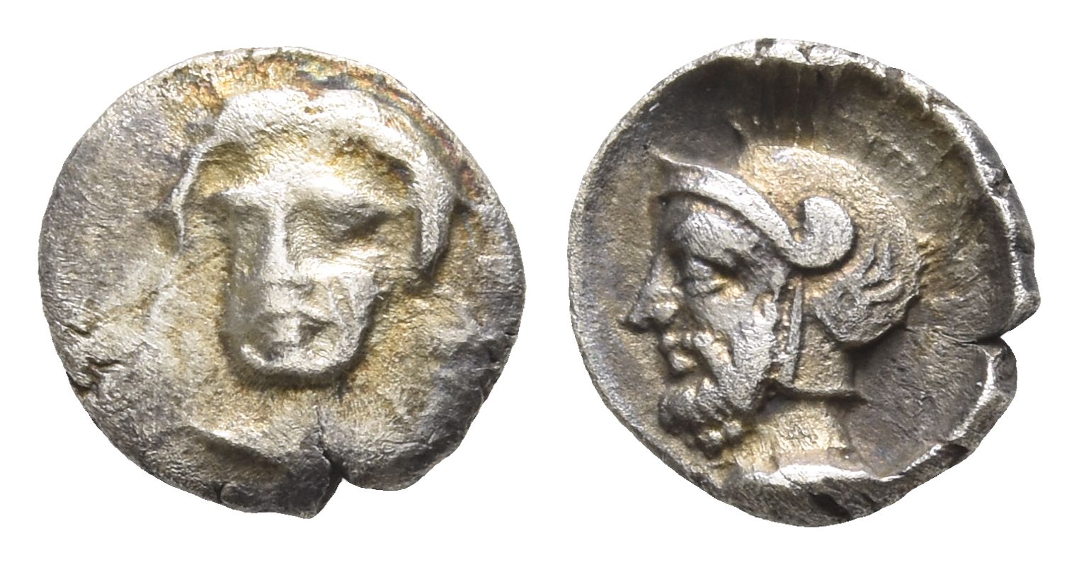 Female head facing slightly to left; [dolphin to lower left?] / Bearded and helmetted male head (Ares?) to left. Casabonne Series 2–3, pl. 4, 14; Göktürk 21; SNG BnF 303. 0.65gr, 9mm, 3h.