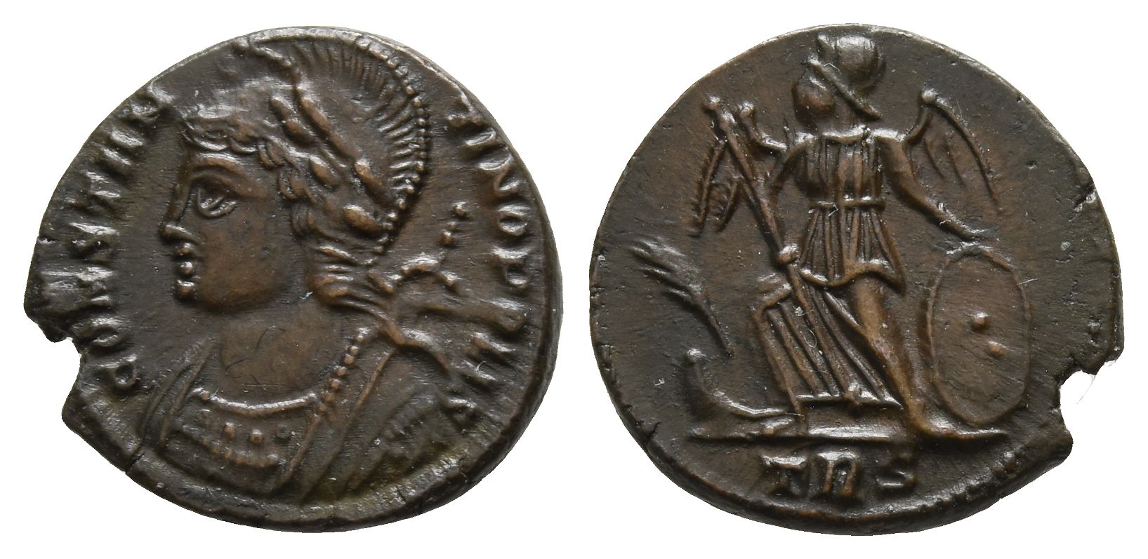 Treveri mint. 2nd officina. CONSTAN-TINOPOLIS, laureate, helmeted and mantled bust of Constantinopolis to left, holding sceptre / Victory standing to left, foot on prow, holding sceptre and resting hand on shield set on ground; palm frond in left field, TRS in exergue. RIC VII 563. 2.55gr, 17mm, 12h.