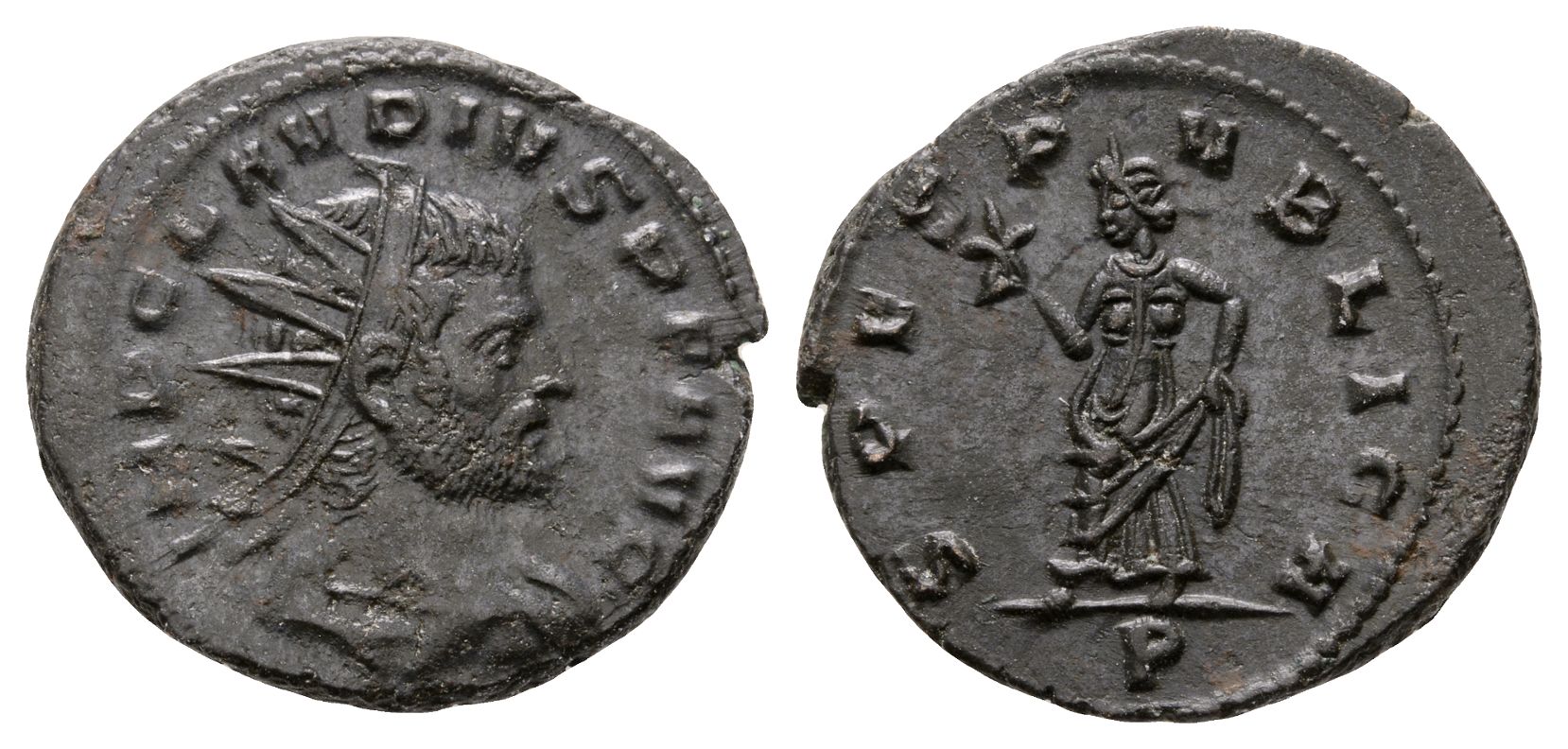Mediolanum mint; struck AD 268-269. 1st officina. IMP CLAVDIVS P F AVG, radiate, draped and cuirassed bust to right / SPES PVBLICA, Spes walking to left, holding flower with right and raising robe with her left hand; P in exergue. RIC V.1, 168; MER-RIC 26 (temporary). 3.66gr, 21mm, 12h