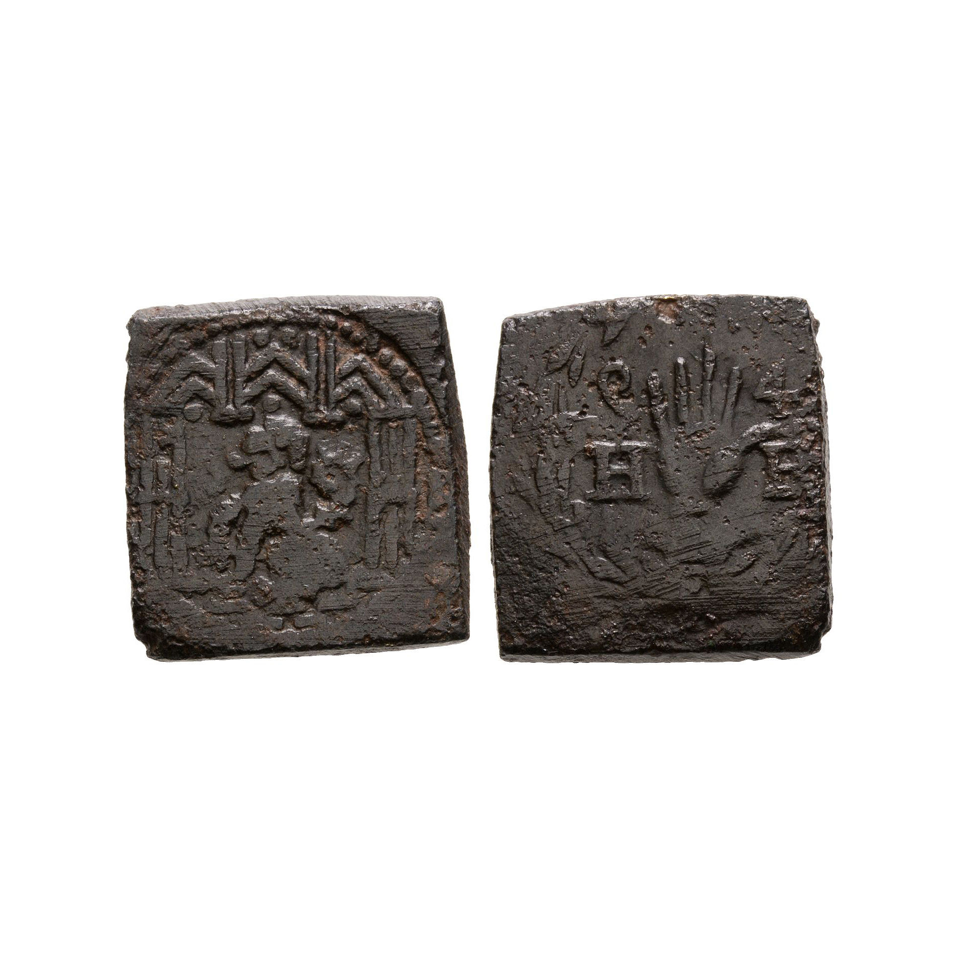 Square flan. Obv: lion seated below arch. Rev: hand with 9 - 1 and H - F across fields for the maker Hans Foncq (1577-1603). 3.75 grams.