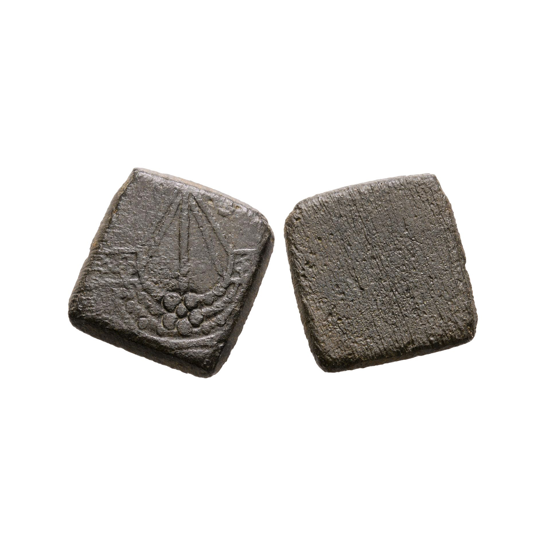 Square flan. Obv: ship with rose on side. Rev: plain. 3.16 grams.