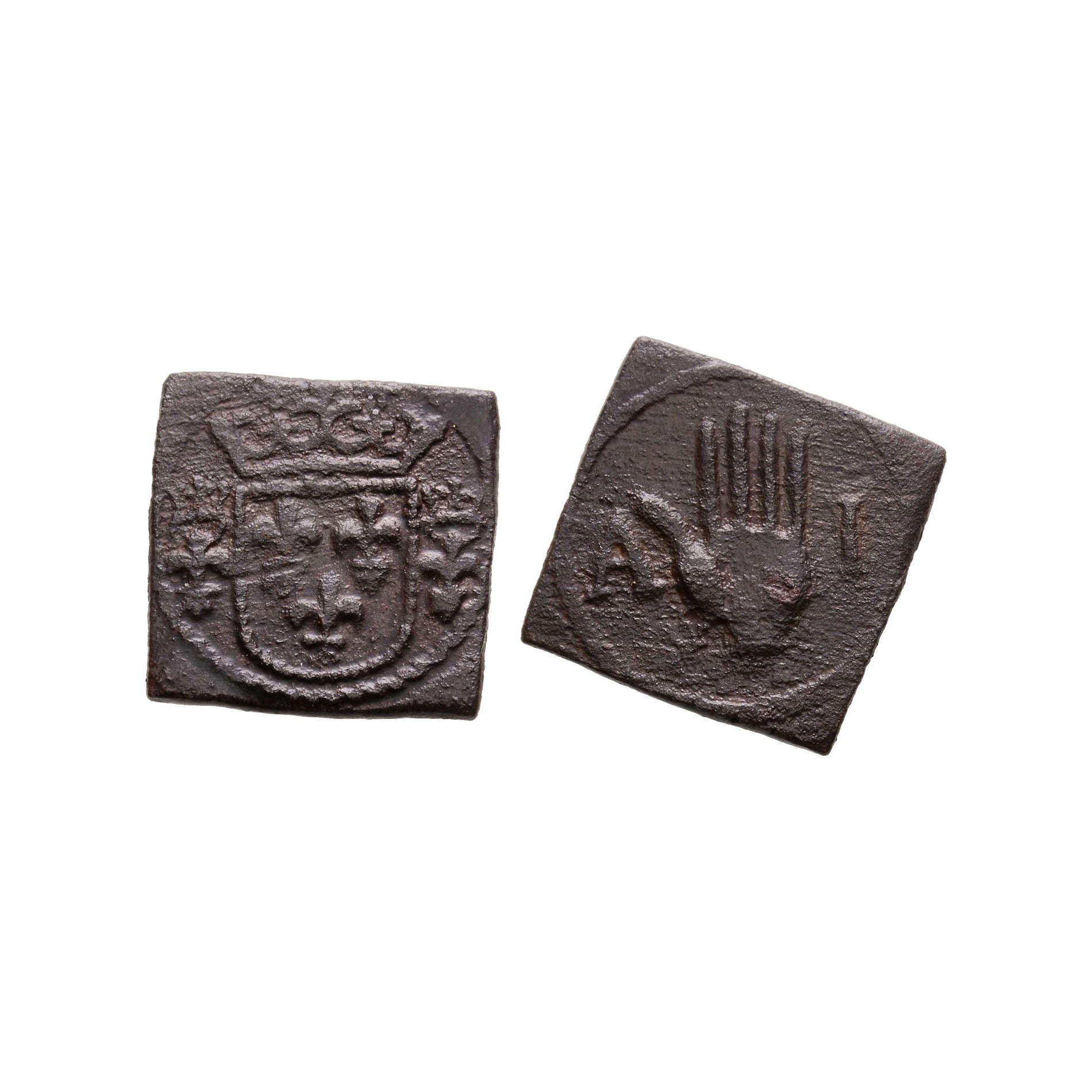 Square flan. Obv: crowned arms of three lis in shield with crown over lis each side. Rev: hand with A left and I right. 1.37 grams.