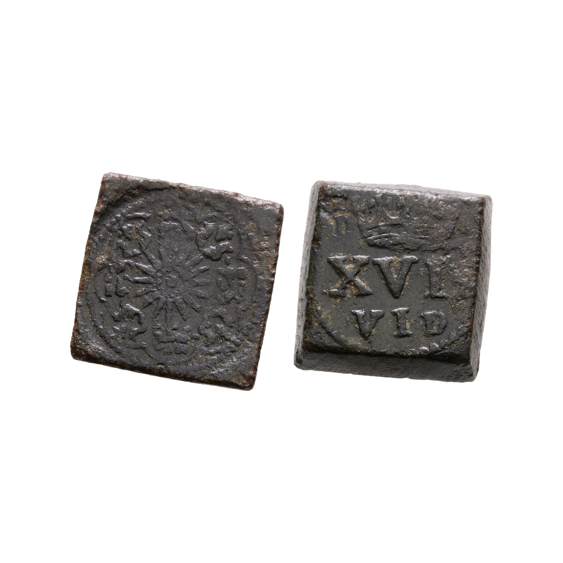 Square flan. Obv: 'spur' in form of sun in splendour with rose at centre within tressure of eight arcs with alternating lion and lis-with-ornament in arcs. Rev: crown above XVIs / VID in two lines; with 'crowned I' verification punch to top left corner. 6.48 grams.