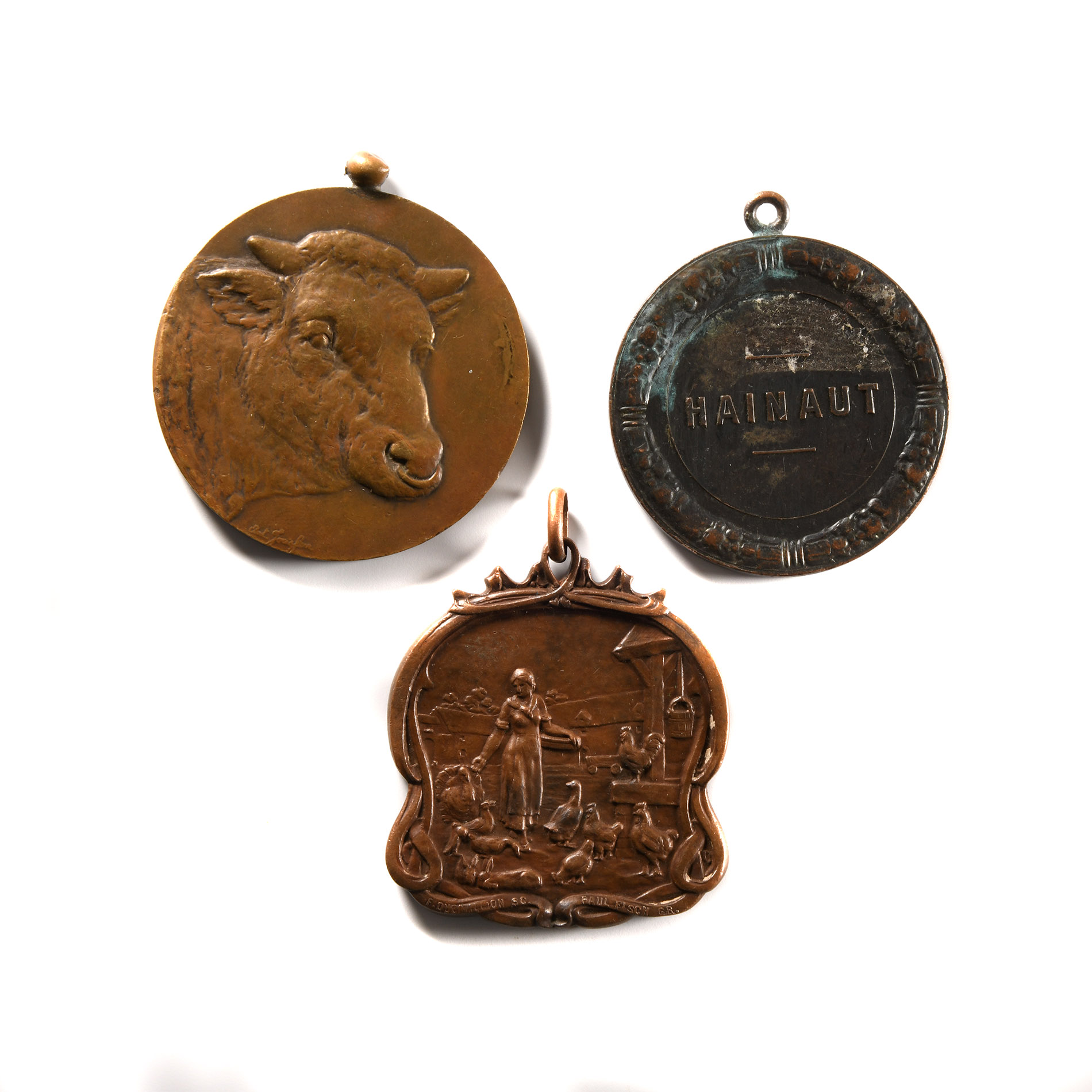 Group comprising: Obv: ROYAUME DE BELGIQUE, AMELIORATION DE LA RACE BOVINE with prize bull standing left, and VERBE TERING VAN HET RUNDERRAS KONINKRIJK BELGIE. Rev: HAINAUT within wreath; Obv: lady feeding chickens within a farm scene. Rev: FEDERATION NATIONALE DES SOCIETES D' AVICULTURE DE BELGIQUE, with EXPOSITION INTERNATIONALE BRUXELLES LES AVICULTUREURS BELGES WITHIN CIRCLE; Obv: bust of prize bull facing right. Rev: CONCOURS NATIONAL 1932 NATIONALE PRIJSKAMP, within wreath. 129 grams total.