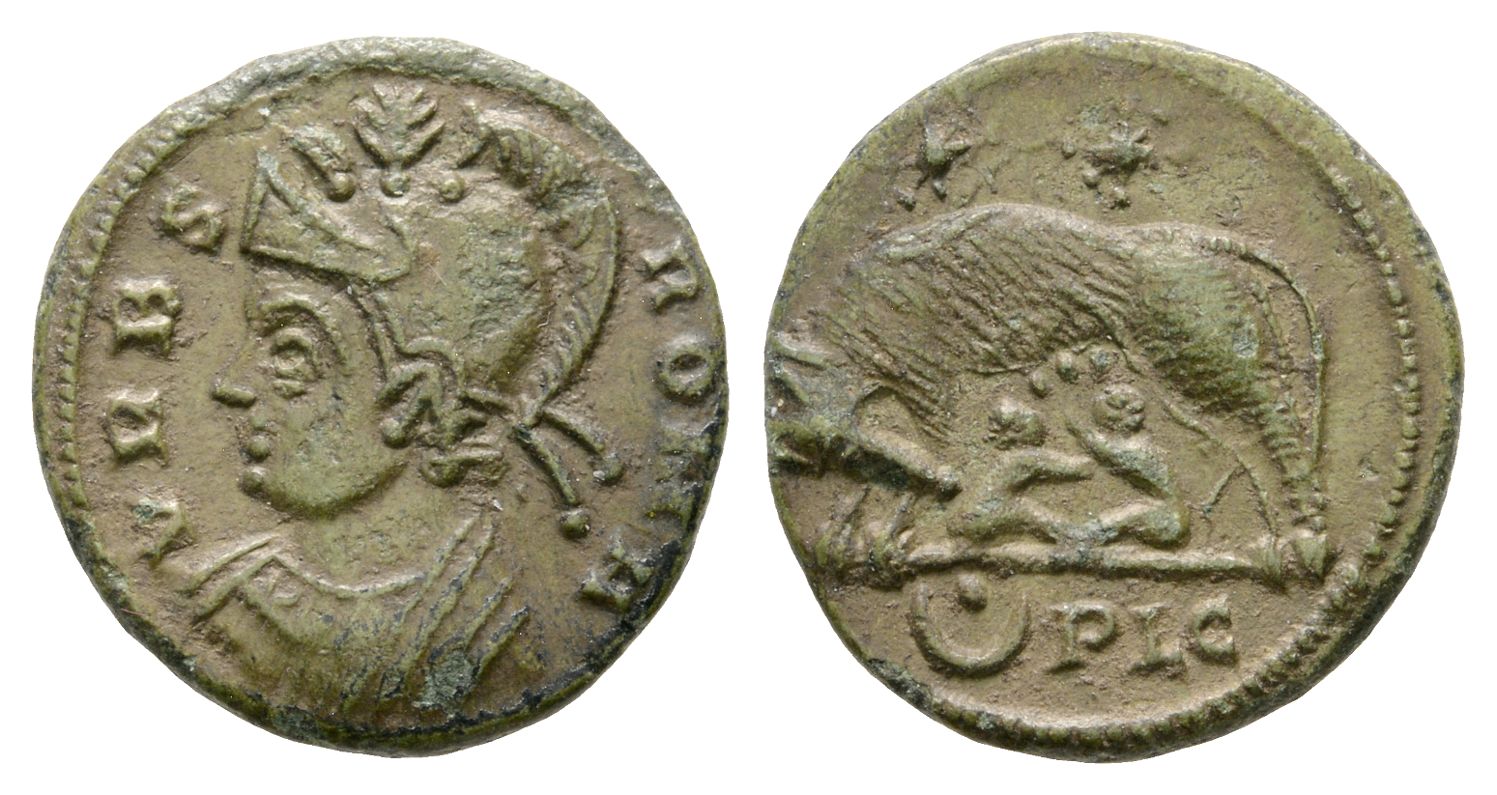 Lugdunum mint; struck under Constantine I, AD 332. 1st officina. VRBS ROMA, bust of Roma to left, wearing crested helmet and imperial mantle / She-wolf standing to left, suckling Romulus and Remus; two stars above; (pellet-in-crescent)PLG in exergue. RIC VII 257. 2.18gr, 16mm, 12h