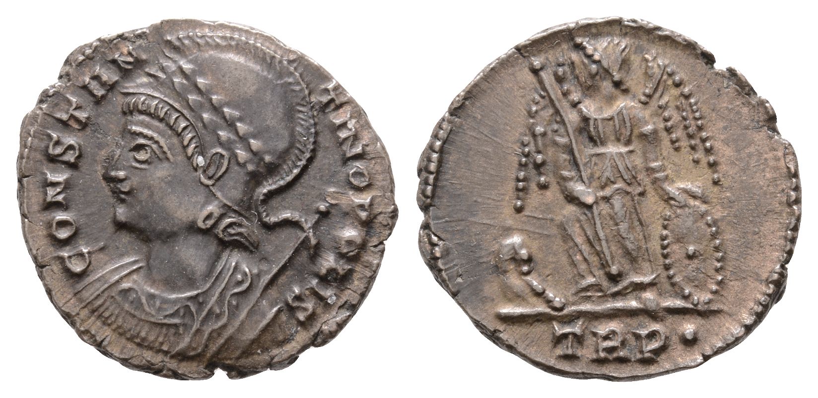 Treveri mint; struck under Constantine I, AD 330-331. 1st officina. CONSTANTINOPOLIS, laureate, helmeted and mantled bust of Constantinopolis to left, sceptre over shoulder / Victory standing to left on prow, holding transverse sceptre and resting hand on shield; TRP • in exergue. RIC VII 530. 2.11gr, 17mm, 5h
