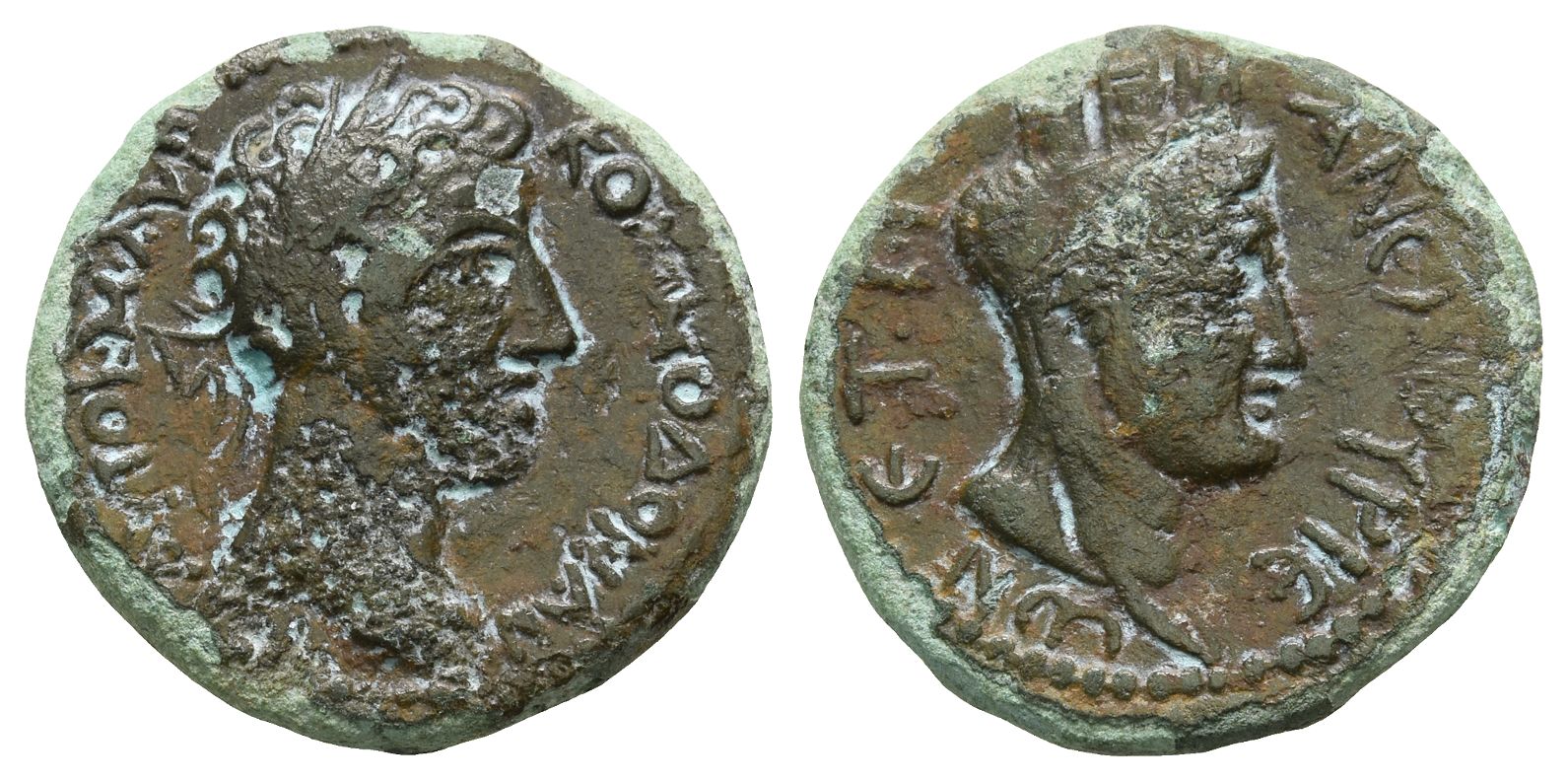 Dated RY 13 (AD 190/1). ΑVΤΟ Κ Μ • ΑVΡ ΚΟΜΜΟΔΟΝ ΑΝ, laureate head to right / ΑΝЄΜOVΡΙЄ-ധΝ, turreted and veiled head of Tyche to right; ЄT • ΓI (date) to left. RPC IV.3, 9559 (temporary); SNG Levante Supp. 112; SNG BnF 703. 5.45gr, 21mm, 6h.