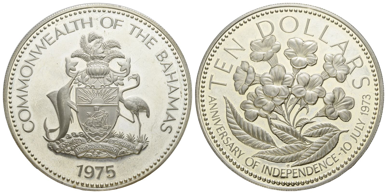 Commemorative issue. COMMONWEALTH OF THE BAHAMAS 1975, Commonwealth of the Bahamas 1975 / TEN DOLLARS ANNIVERSARY OF INDEPENDENCE