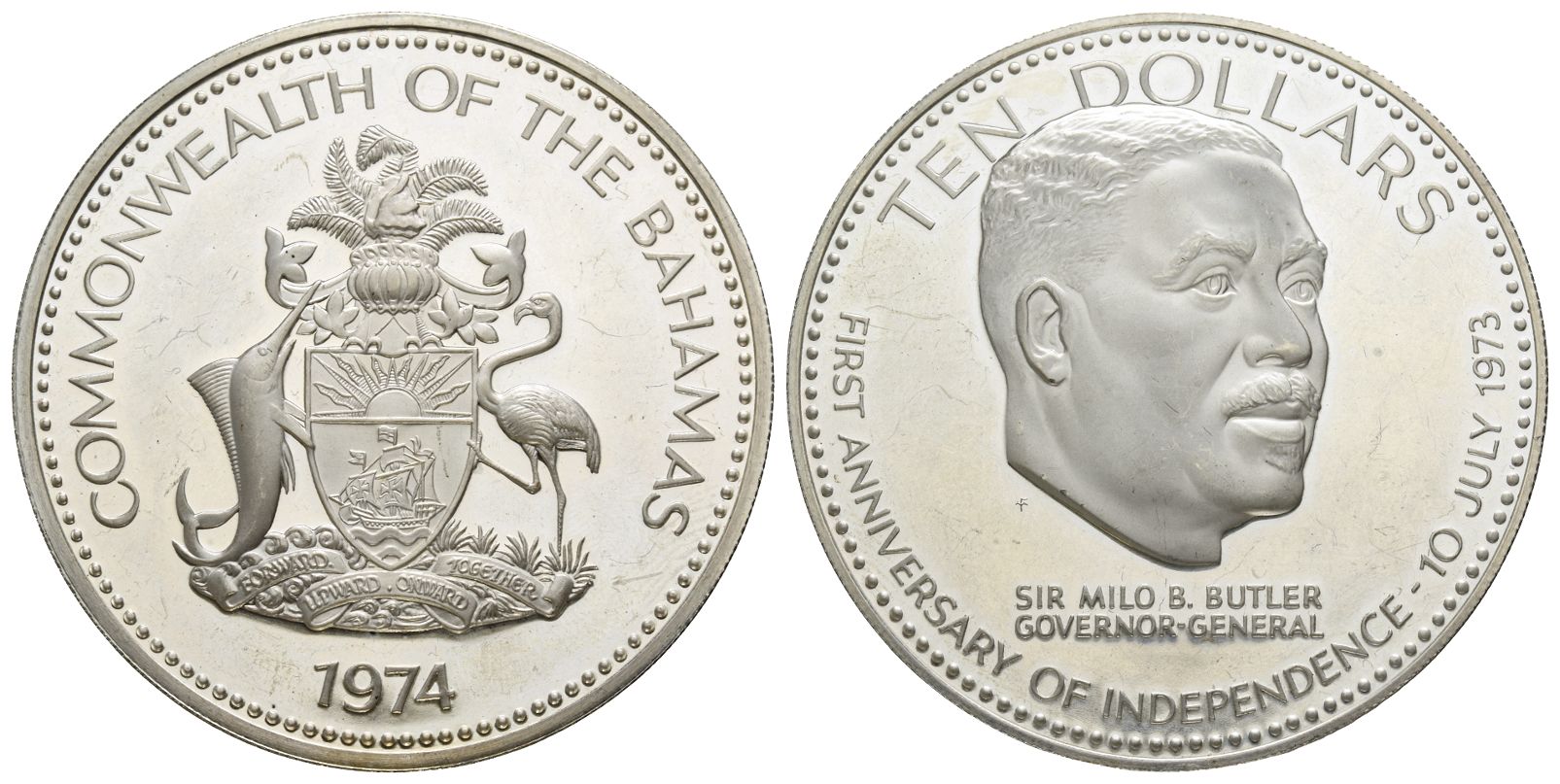 Commemorative issue. COMMONWEALTH OF THE BAHAMAS 1974, Coat of Arms / TEN DOLLARS FM SIR MILO B.BUTLER GOVERNOR GENERAL