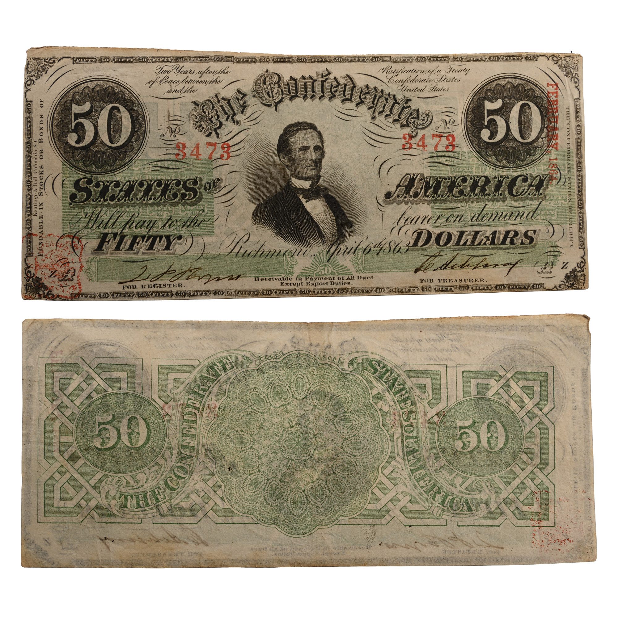 Back to previous pageConfederate States of America, Fifty Dollars T57. Richmond, 6 April 1863. S/N: 3473.