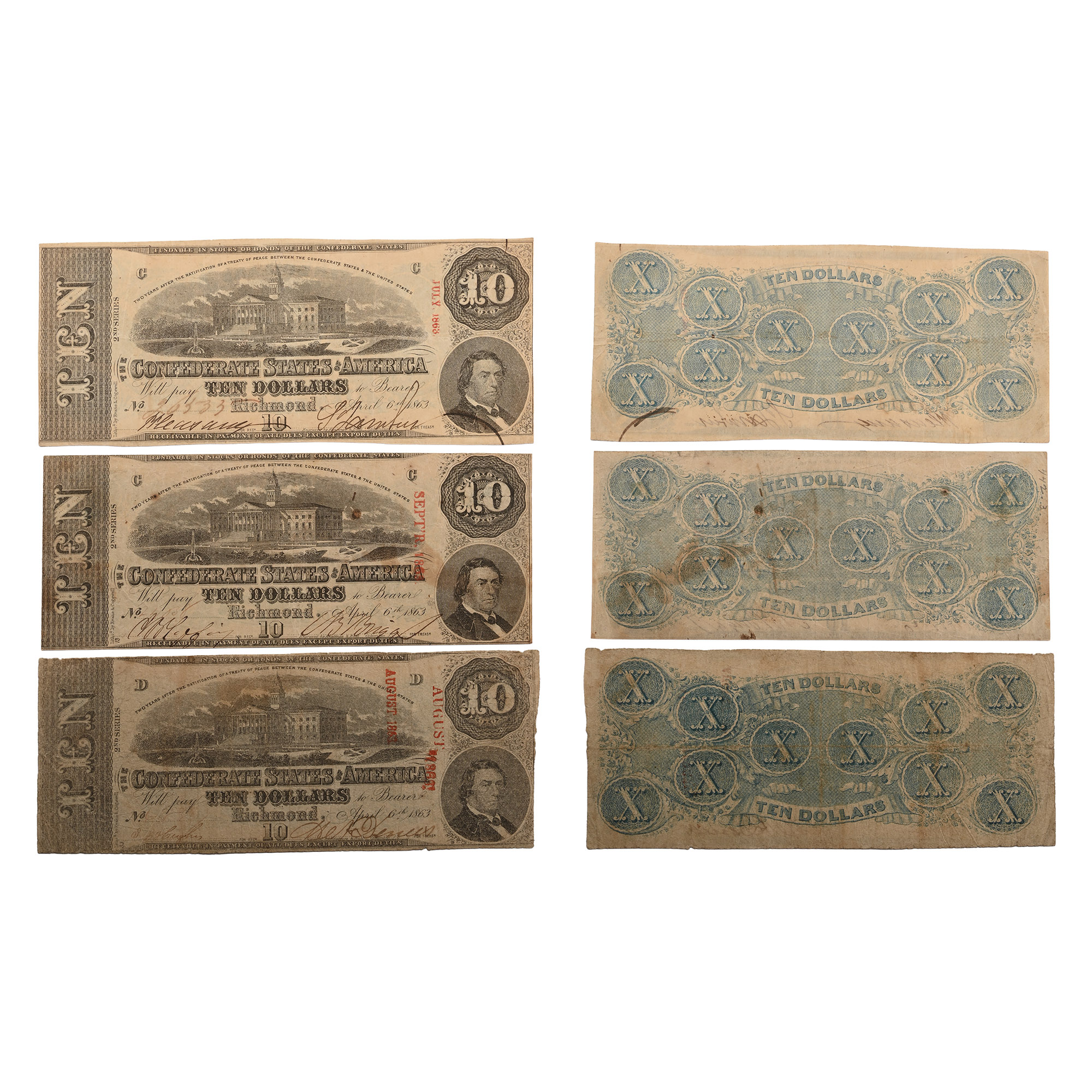 Back to previous pageConfederate States of America. Group of Three [3] Ten Dollars T59. Richmond, 6 April 1863. Second series.