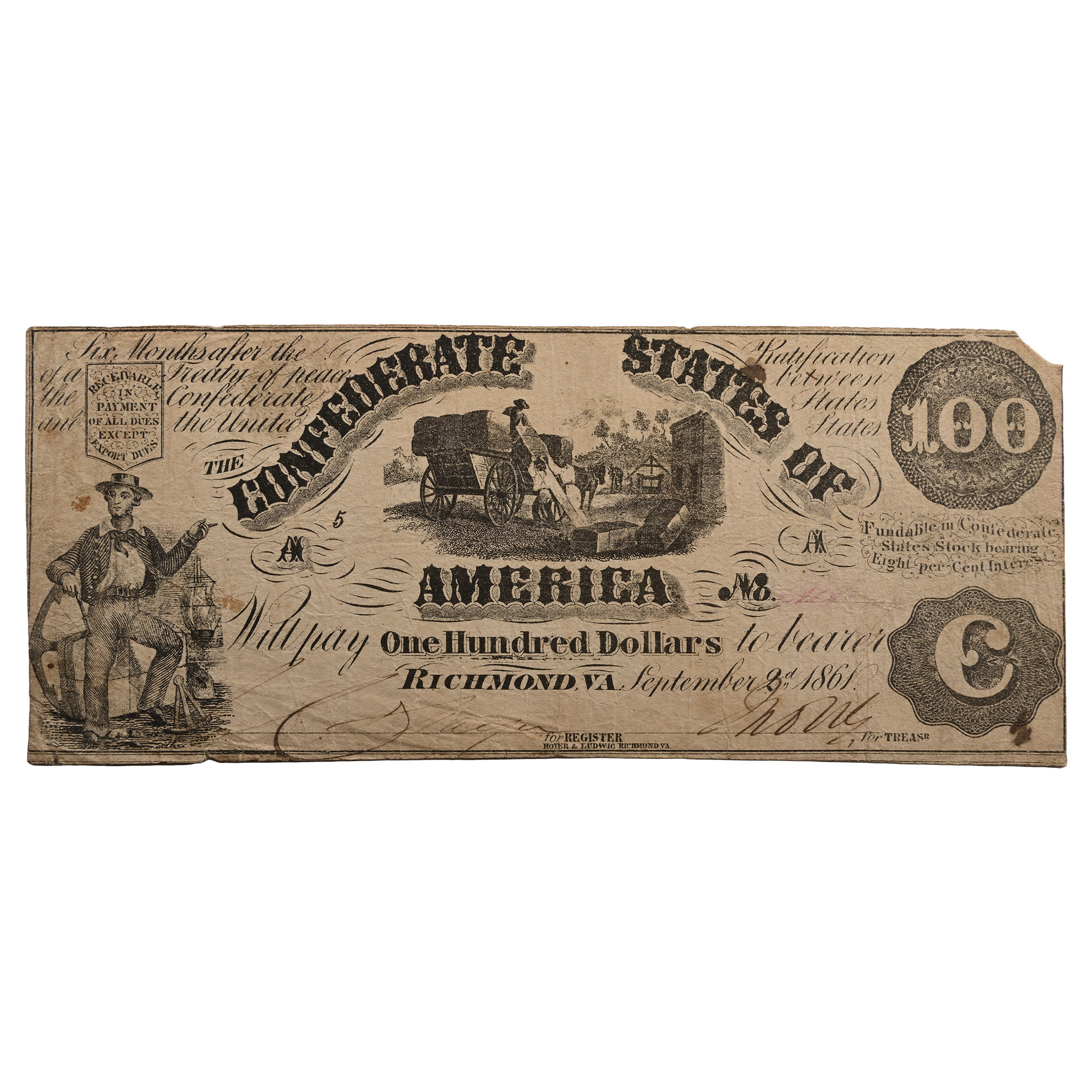 Back to previous pageConfederate States of America, One Hundred Dollars T13. Richmond, 2 September 1861. S/N: uncertain.